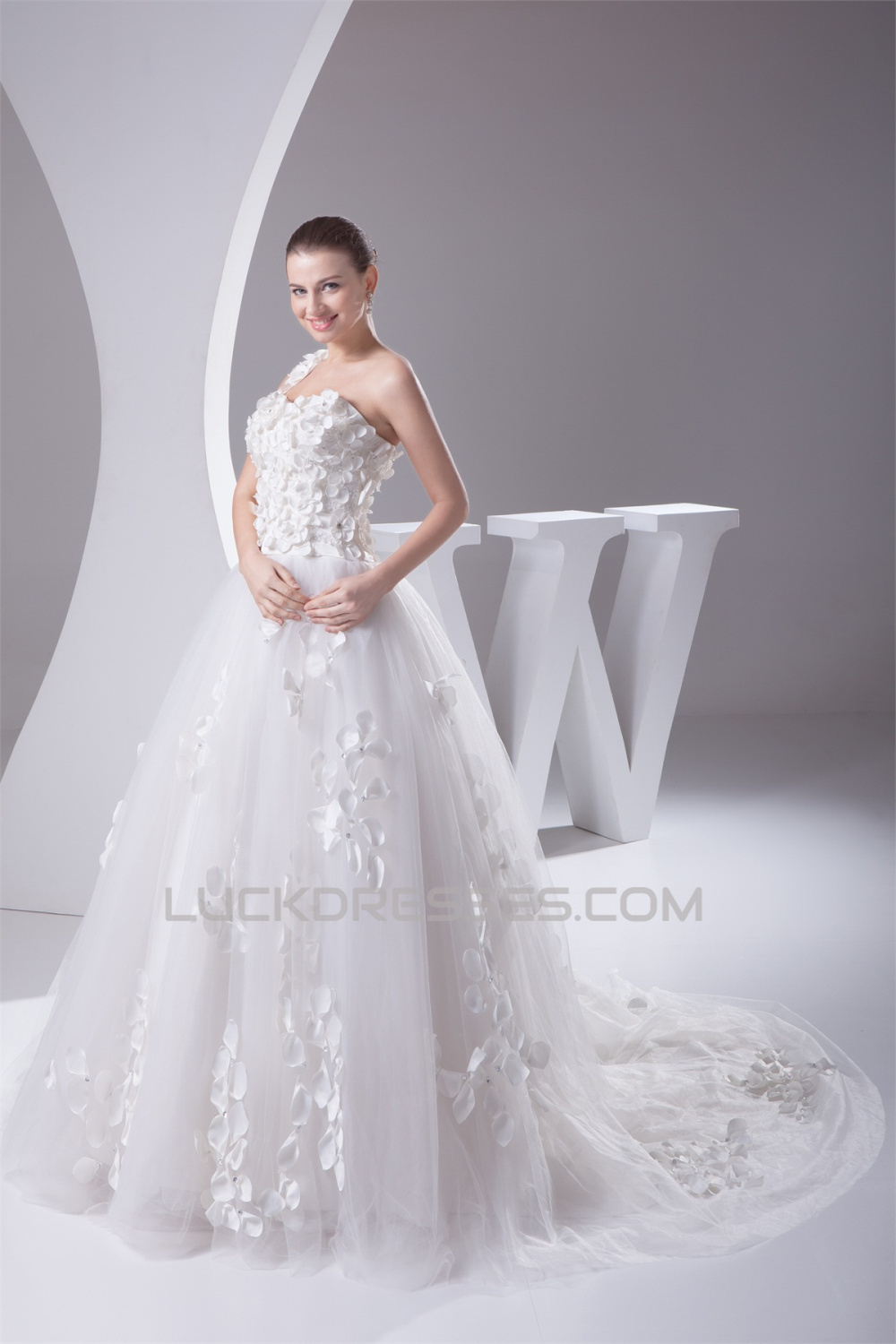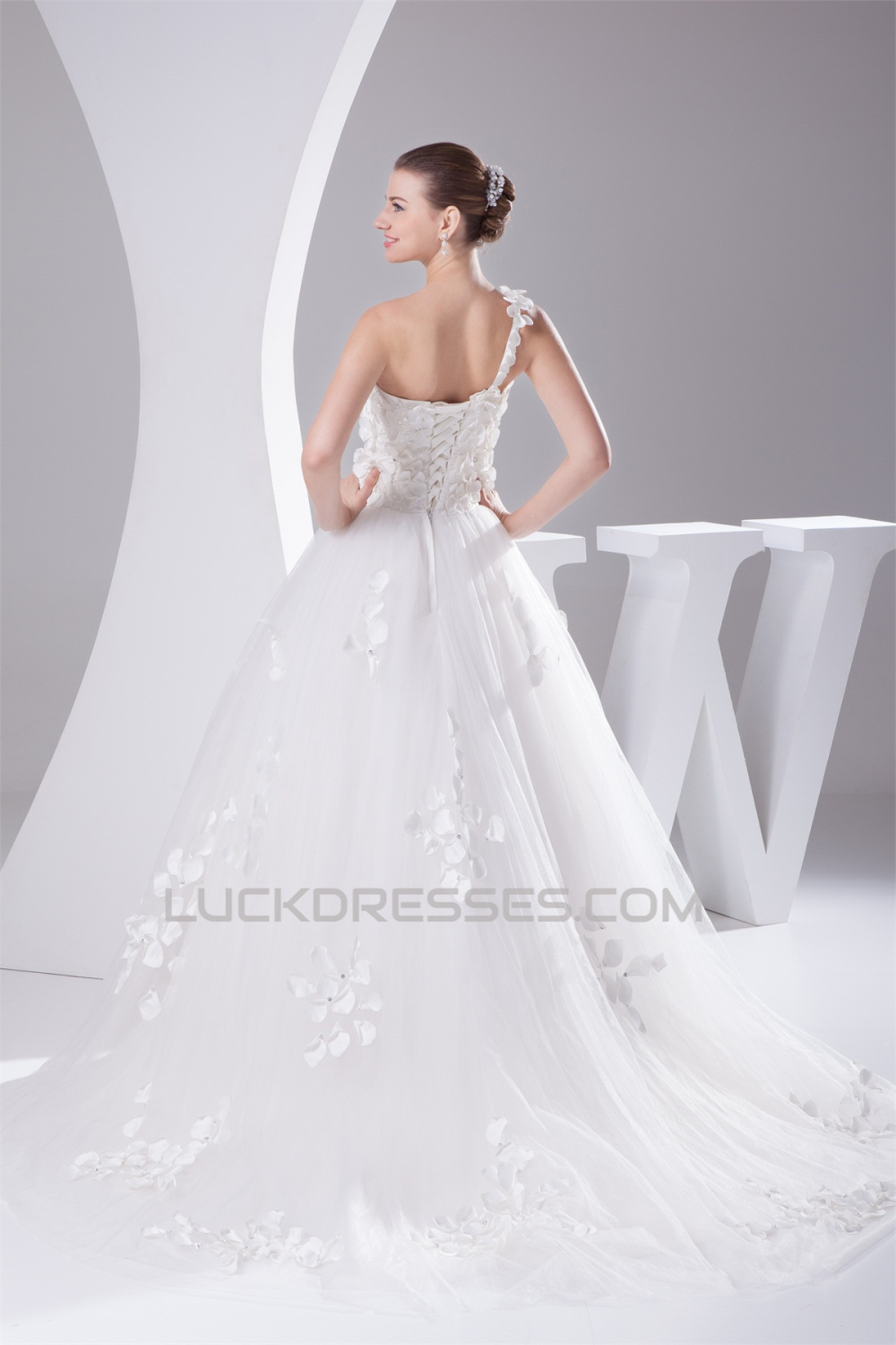 A-Line Sleeveless One-Shoulder Satin Fine Netting Wedding Dresses 2030239