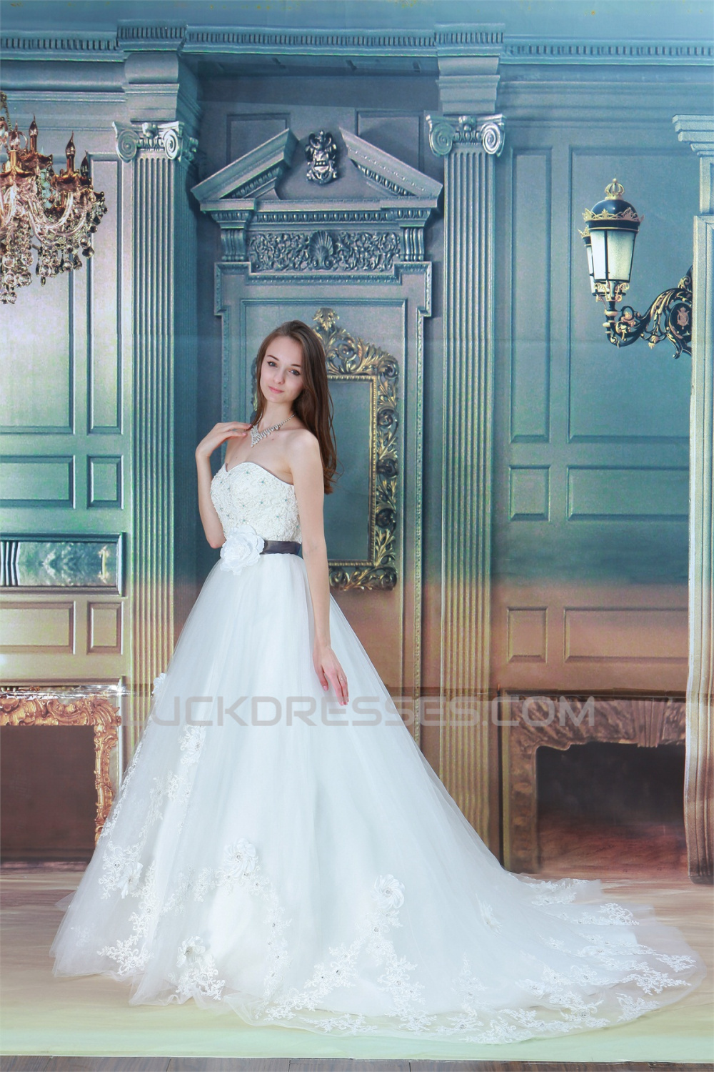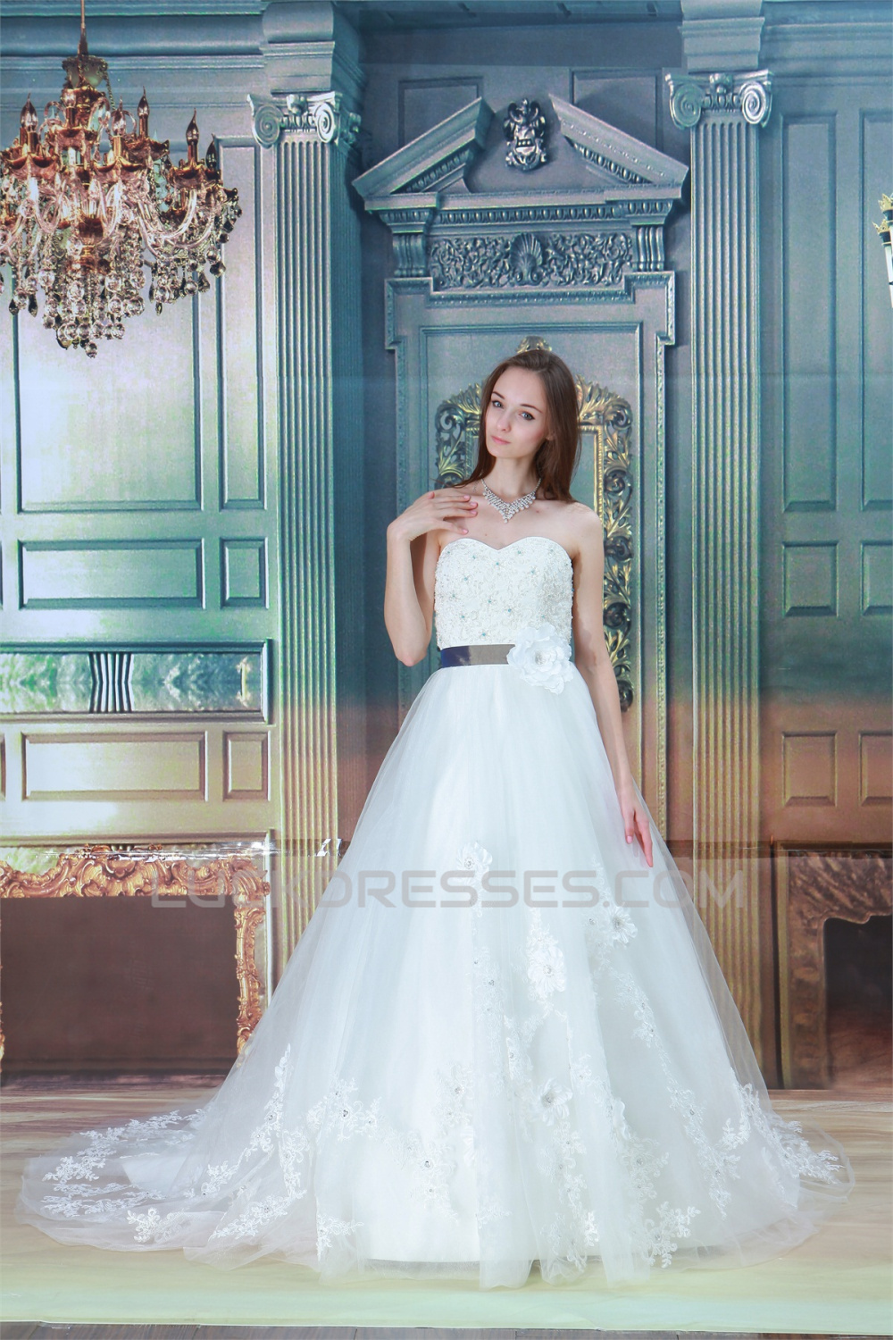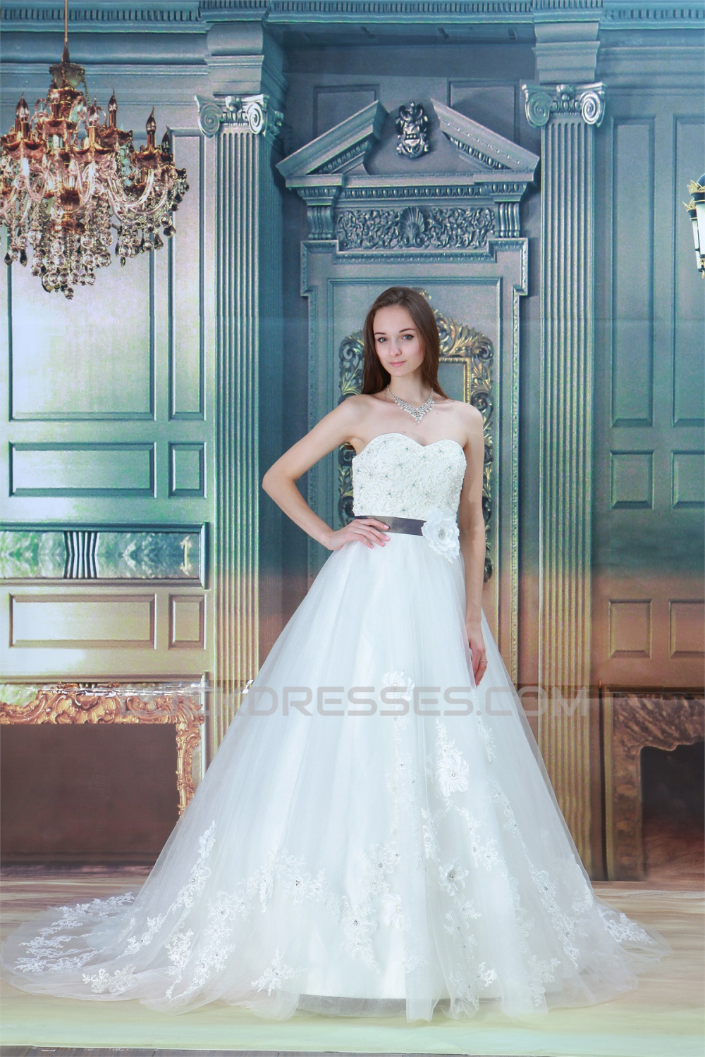 A-Line Sleeveless Satin Fine Netting Lace Sweetheart Wedding Dresses 2030542
