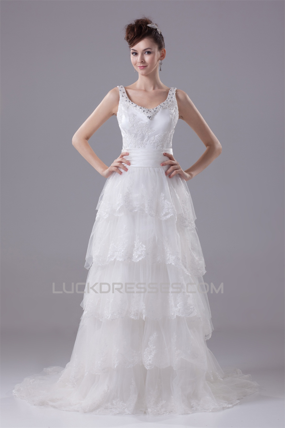 -50% A-Line Sleeveless Scoop Satin Lace Wedding Dresses 2030314
