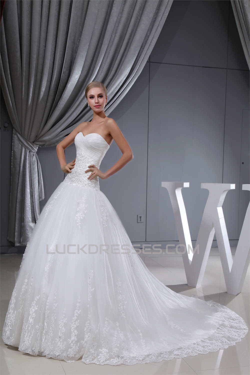 A-Line Sleeveless Sweetheart Satin Lace Fine Netting Wedding Dresses 2030423
