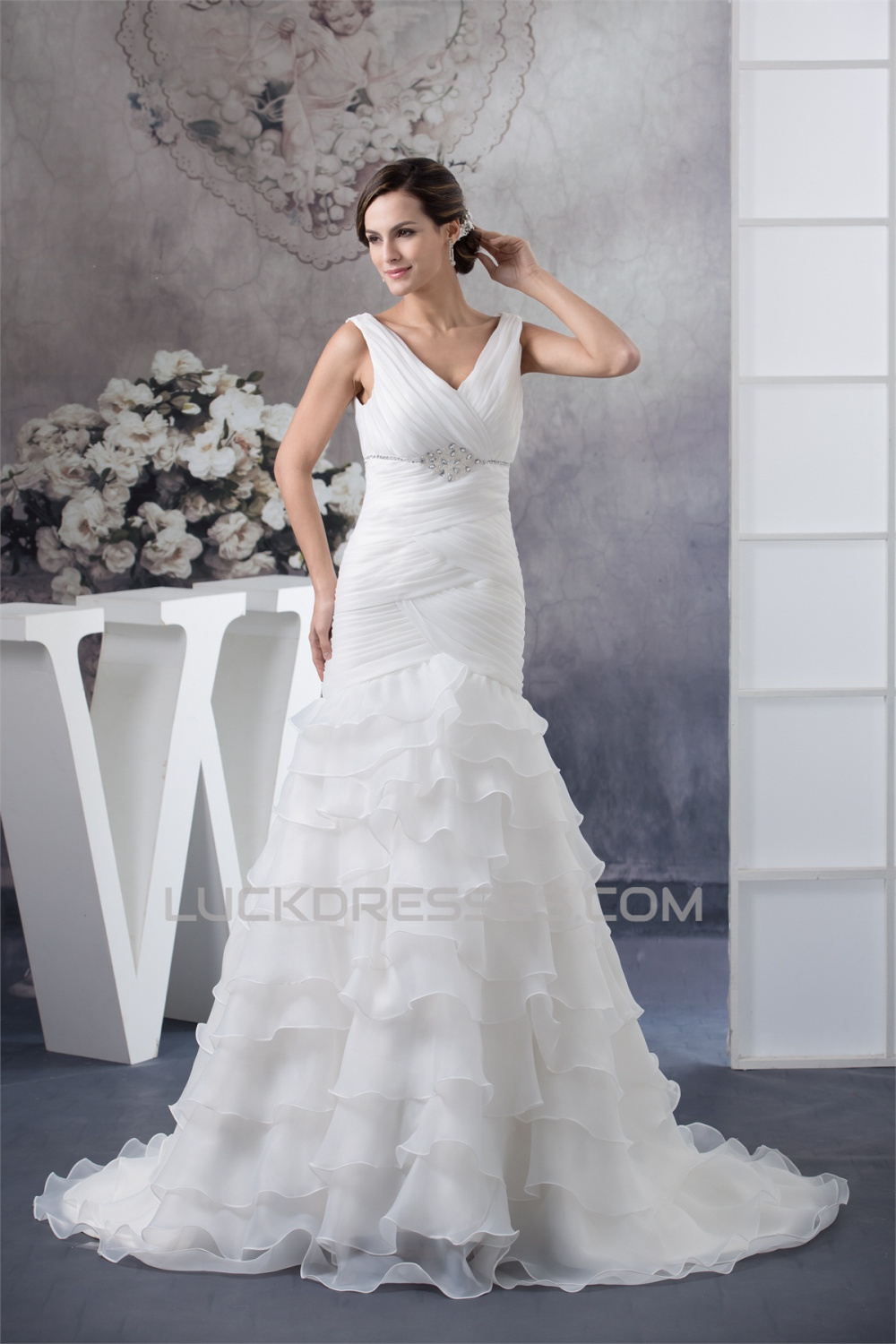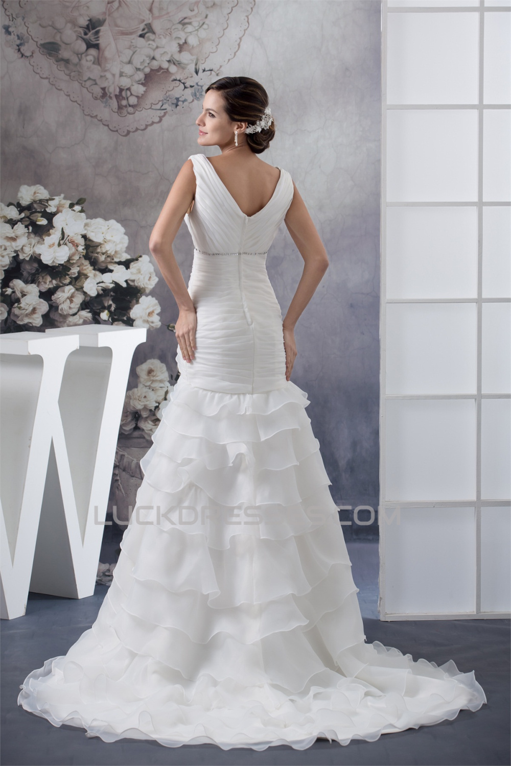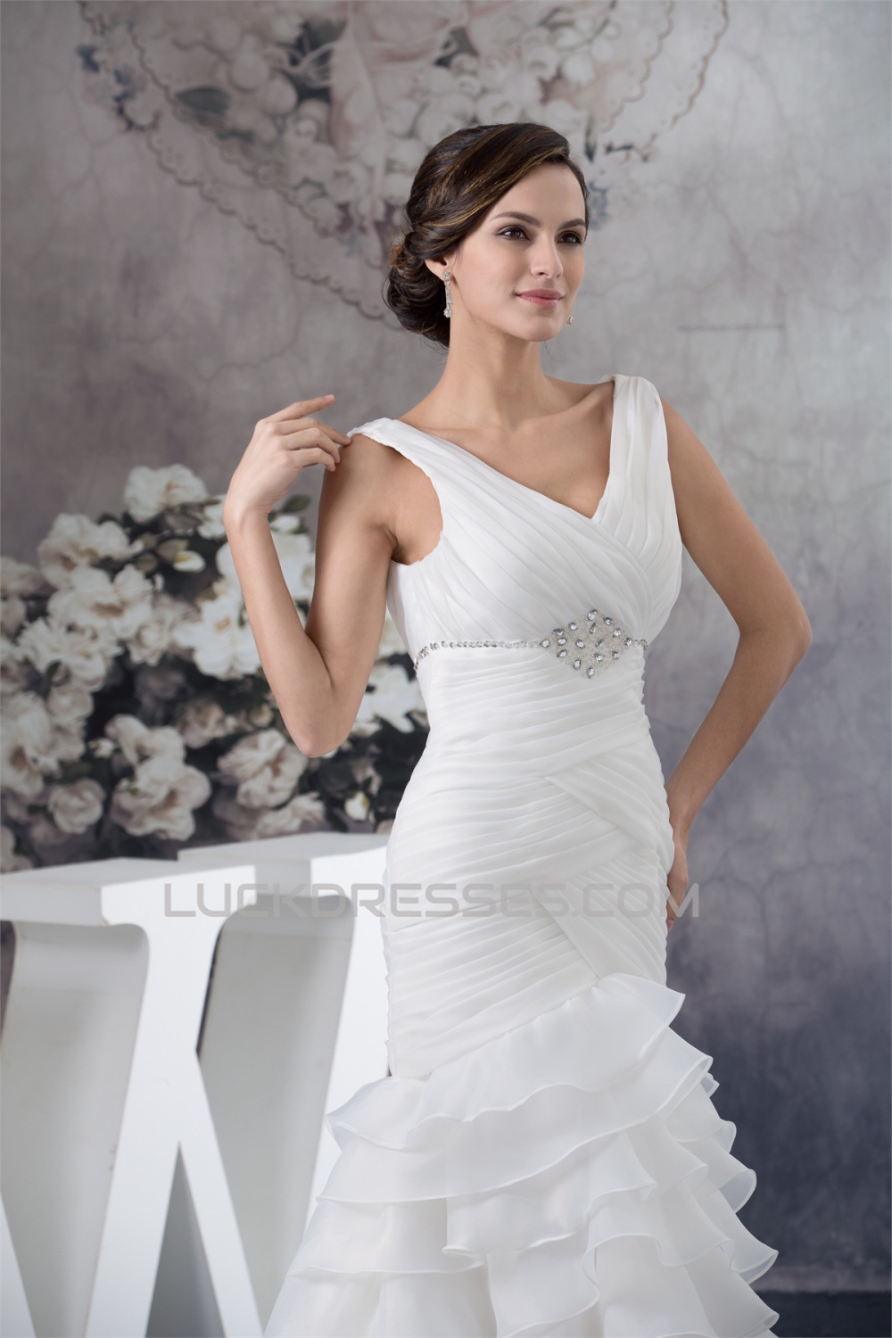 -50% A-Line Sleeveless V-Neck Satin Organza Most Beautiful Beaded Wedding Dresses 2030037