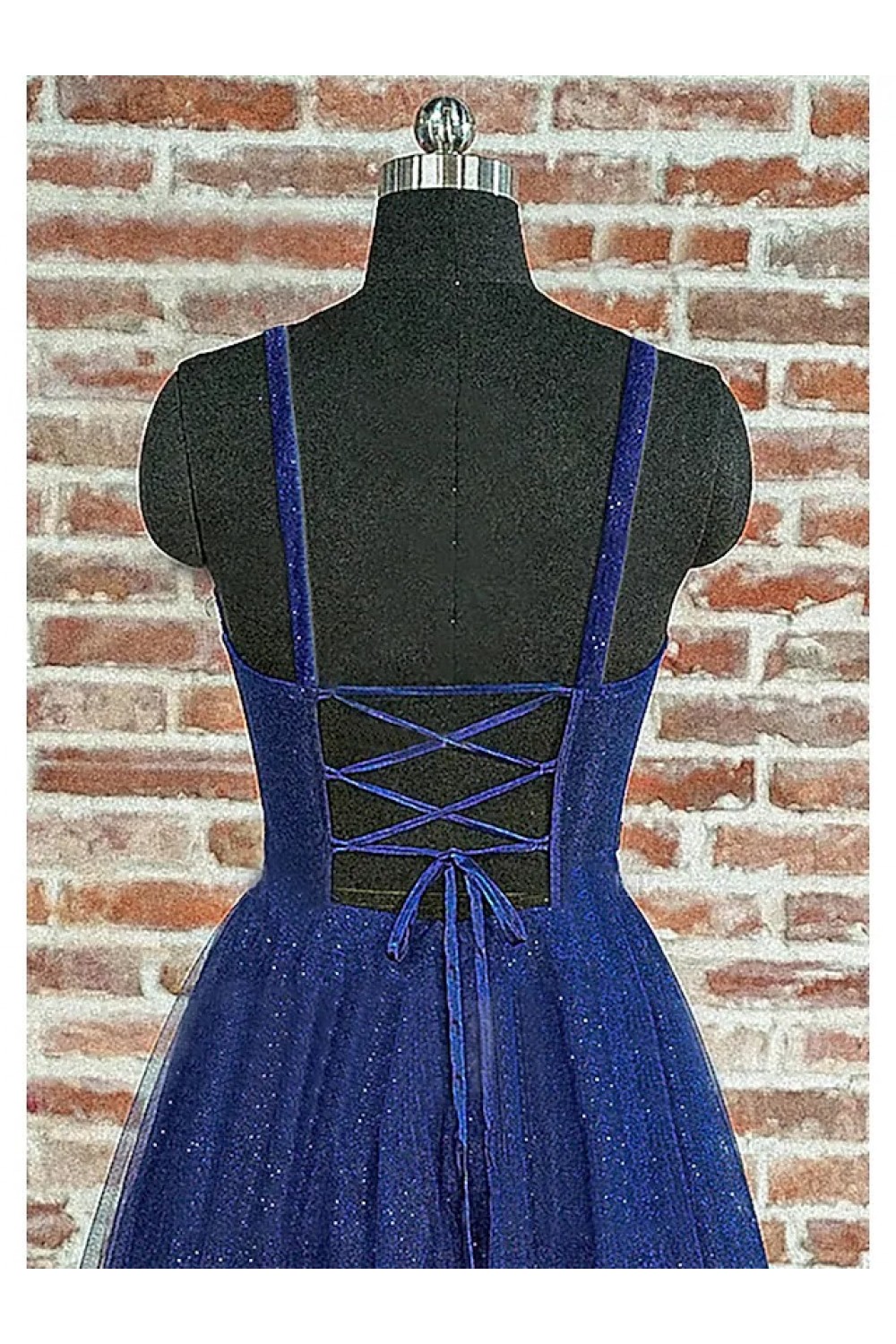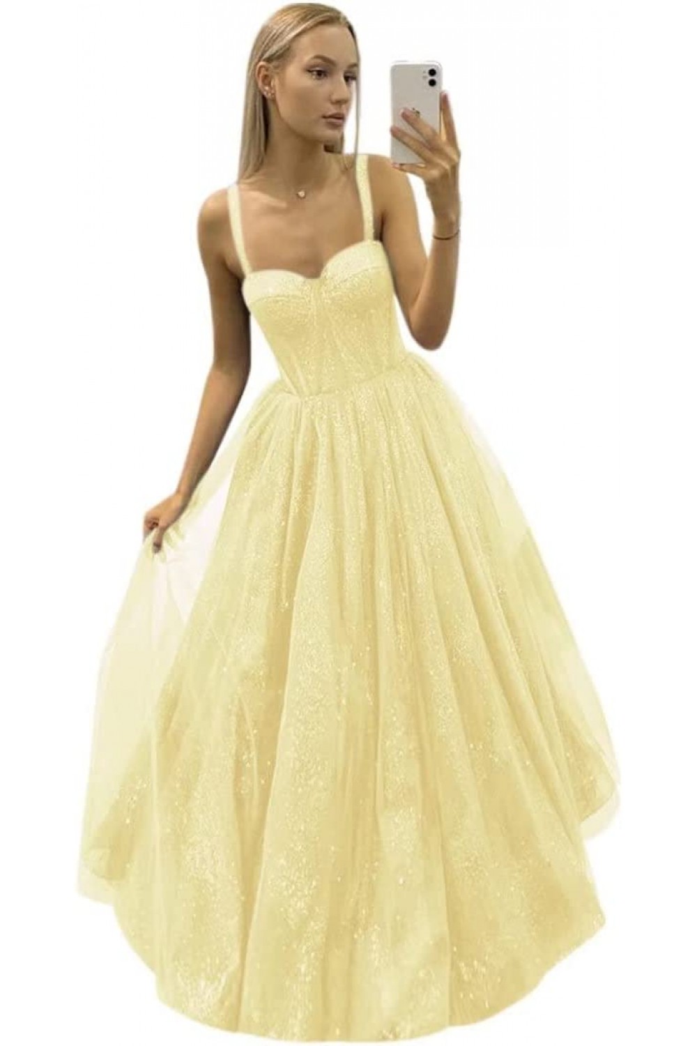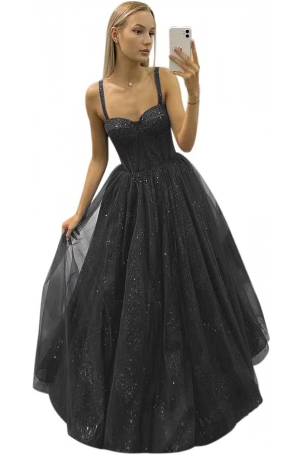 A-Line Sparkle Sweetheart Tulle Backless Long Prom Dresses Formal Evening Dresses 901899