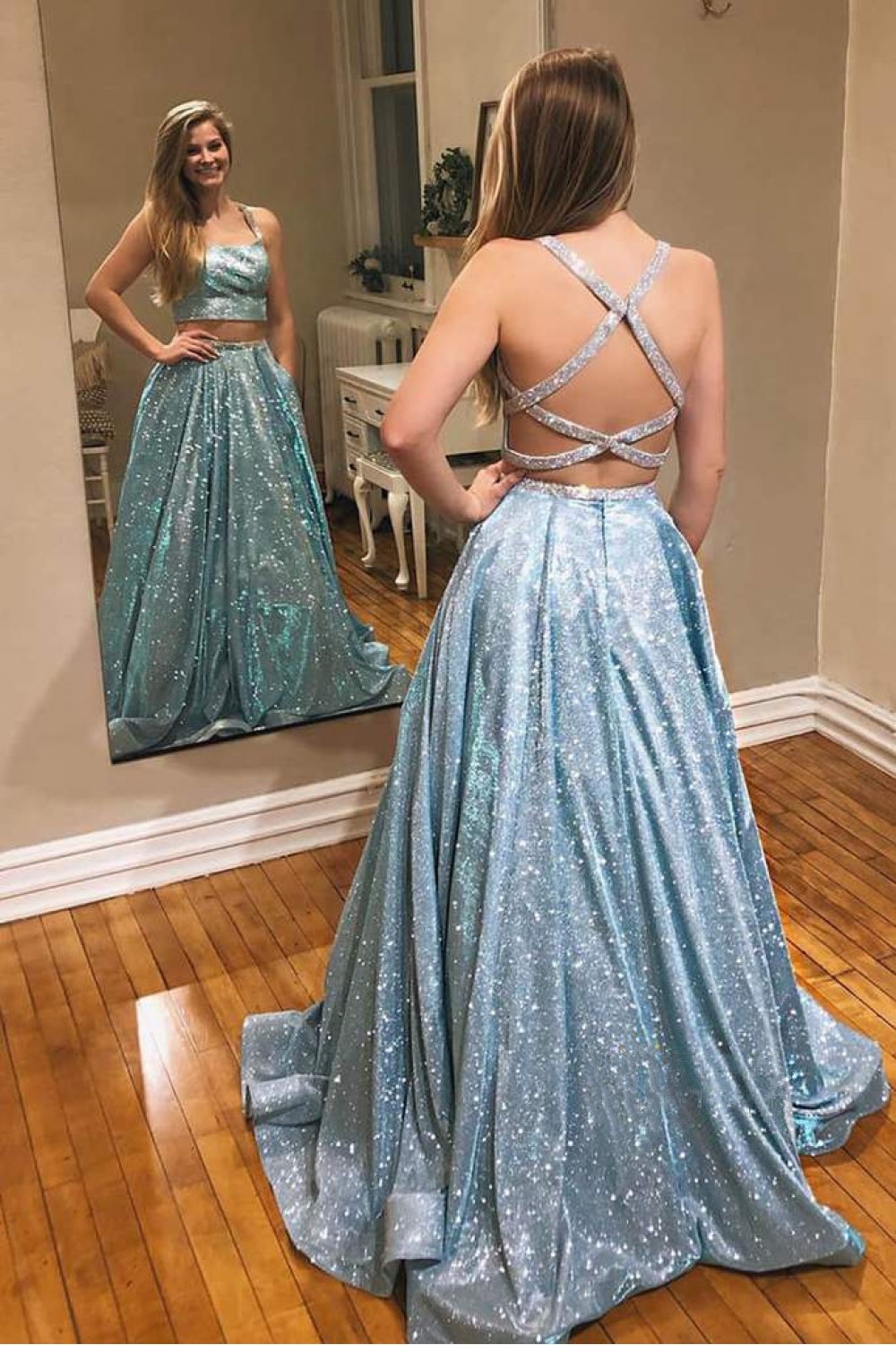 A-Line Sparkle Two Pieces Long Prom Dress Formal Evening Gowns 901252