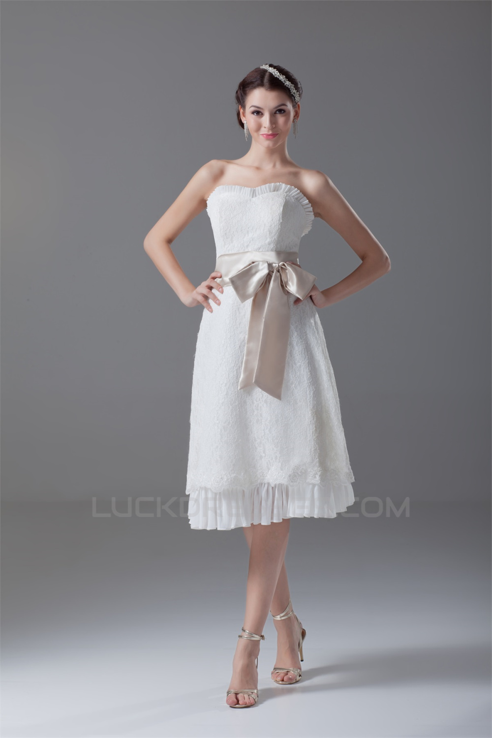 A-Line Strapless Satin Lace Sleeveless Short Wedding Dresses 2031549