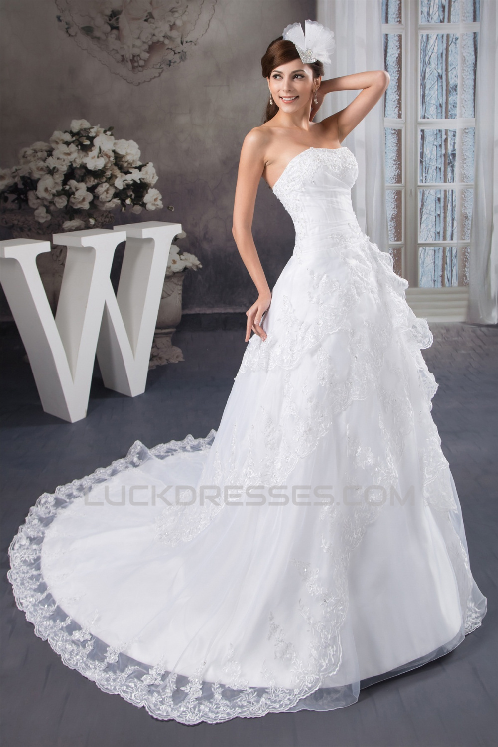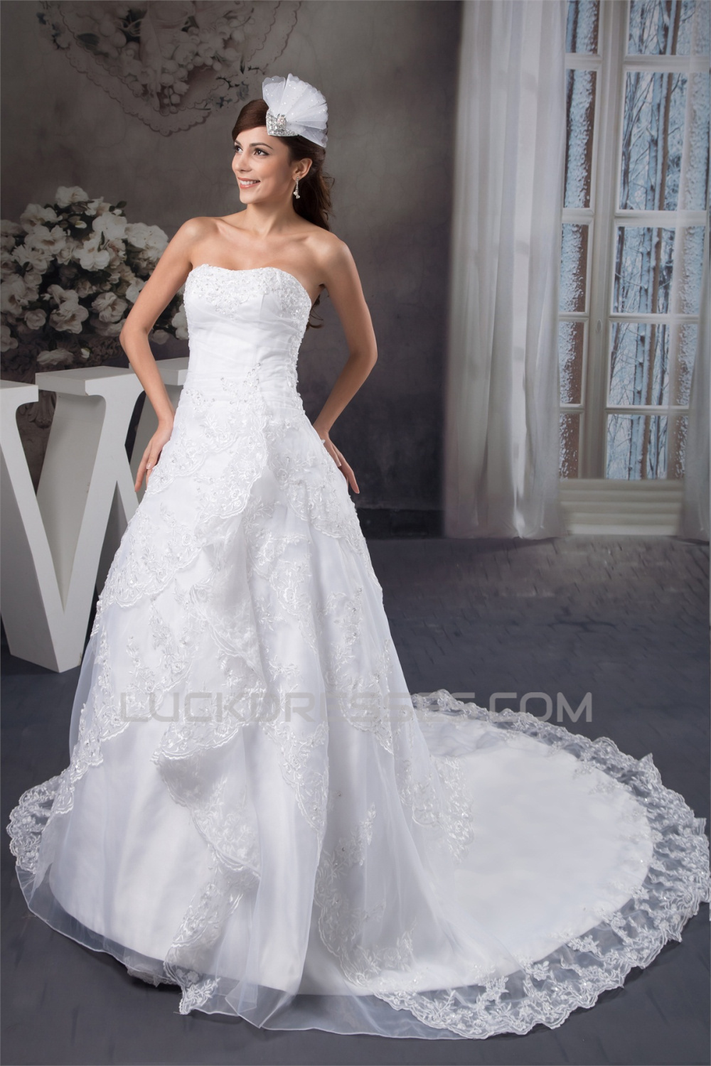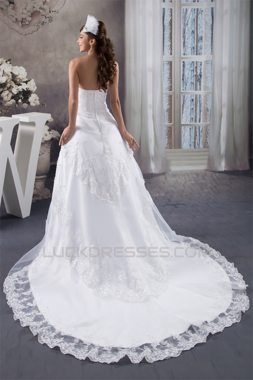 -50% A-Line Strapless Satin Lace Wedding Dresses 2030979