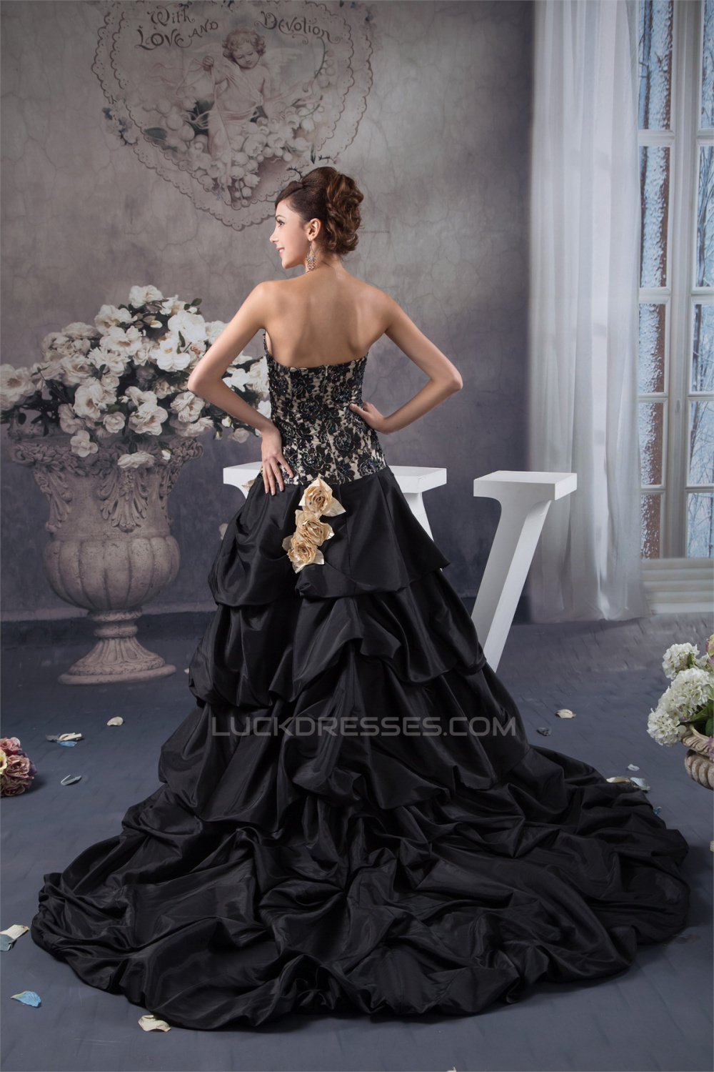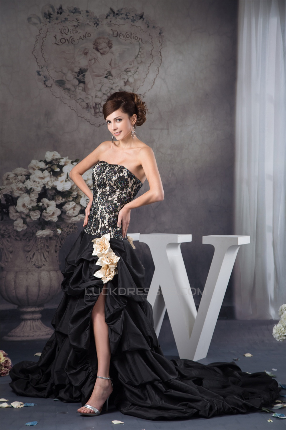 A-Line Strapless Satin Taffeta Lace Handmade Flowers Prom/Formal Evening Dresses 02020465