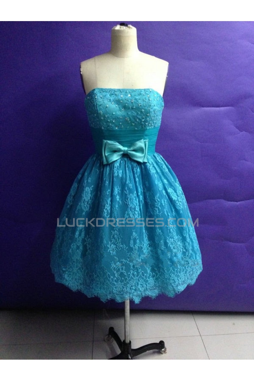 A-Line Strapless Short Beaded Blue Lace Prom Evening Bridesmaid Dresses ED011502