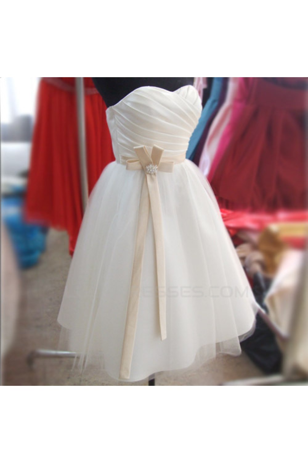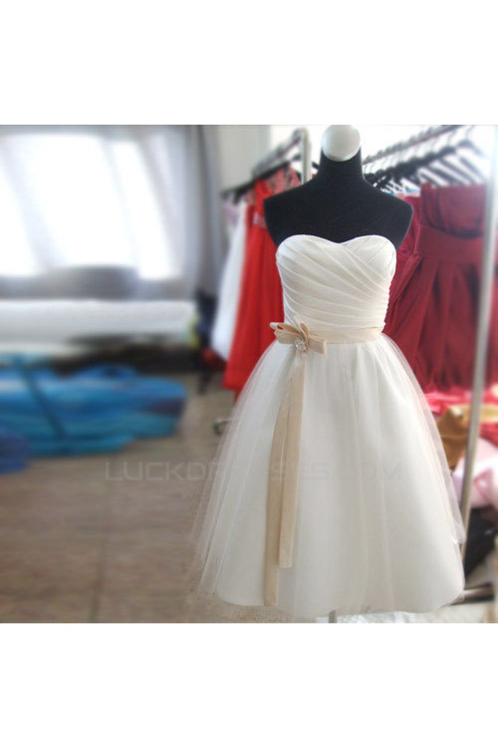 A-Line Strapless Short Satin and Tulle Bridesmaid Dresses/Evening Dresses BD010654