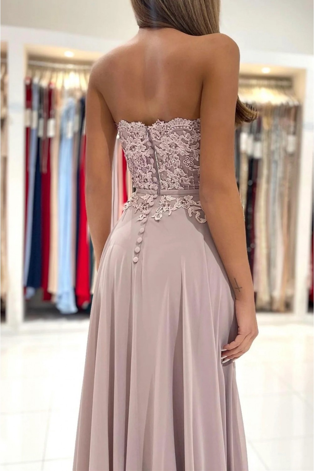 A-Line Sweetheart Chiffon and Lace Long Prom Dresses with Slit 801010