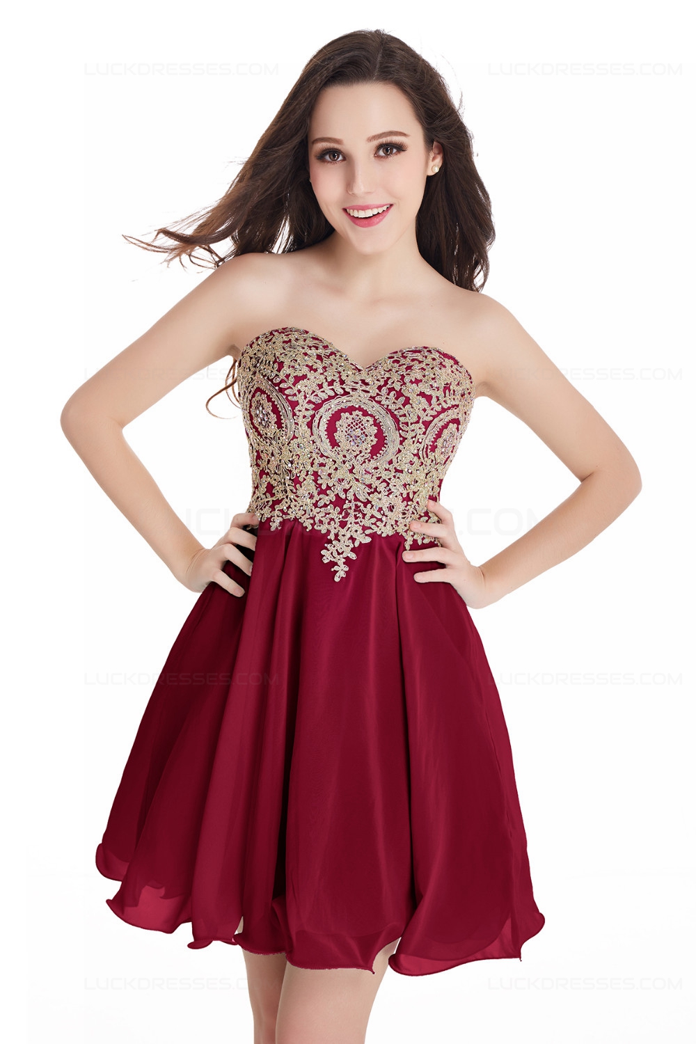 A-Line Sweetheart Gold Lace Appliques Short Purple Prom Dresses Party Evening Gowns 3020285