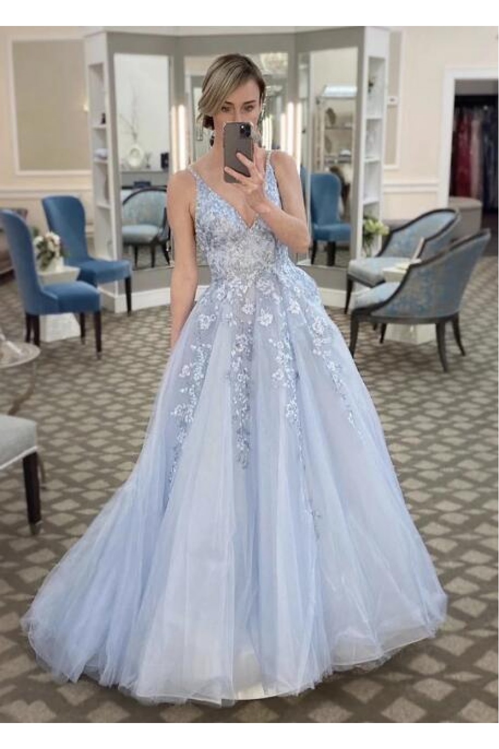 A-Line Tulle Lace V-Neck Long Prom Dresses Formal Evening Gowns 601973