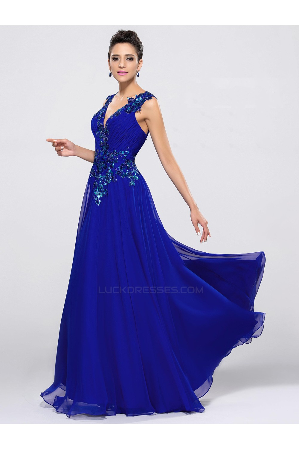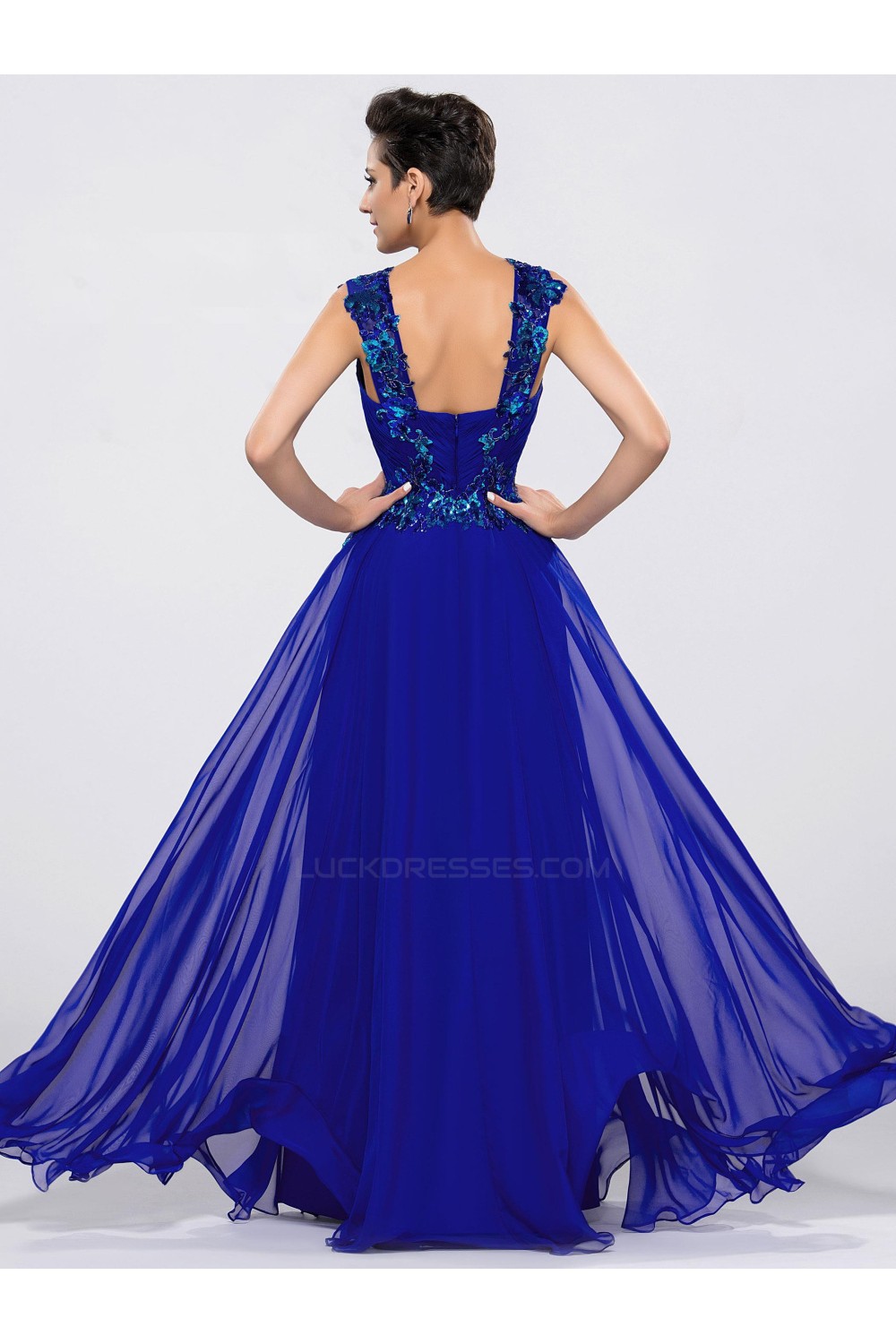 A-Line V-Neck Applique Long Blue Chiffon Prom Evening Formal Party Dresses ED010650