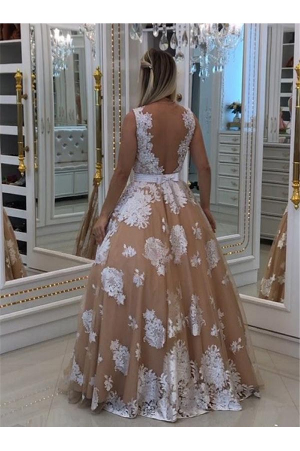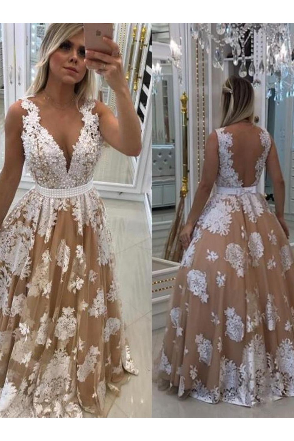 A-Line V-Neck Beaded Lace Long Prom Dresses Formal Evening Dresses 601170