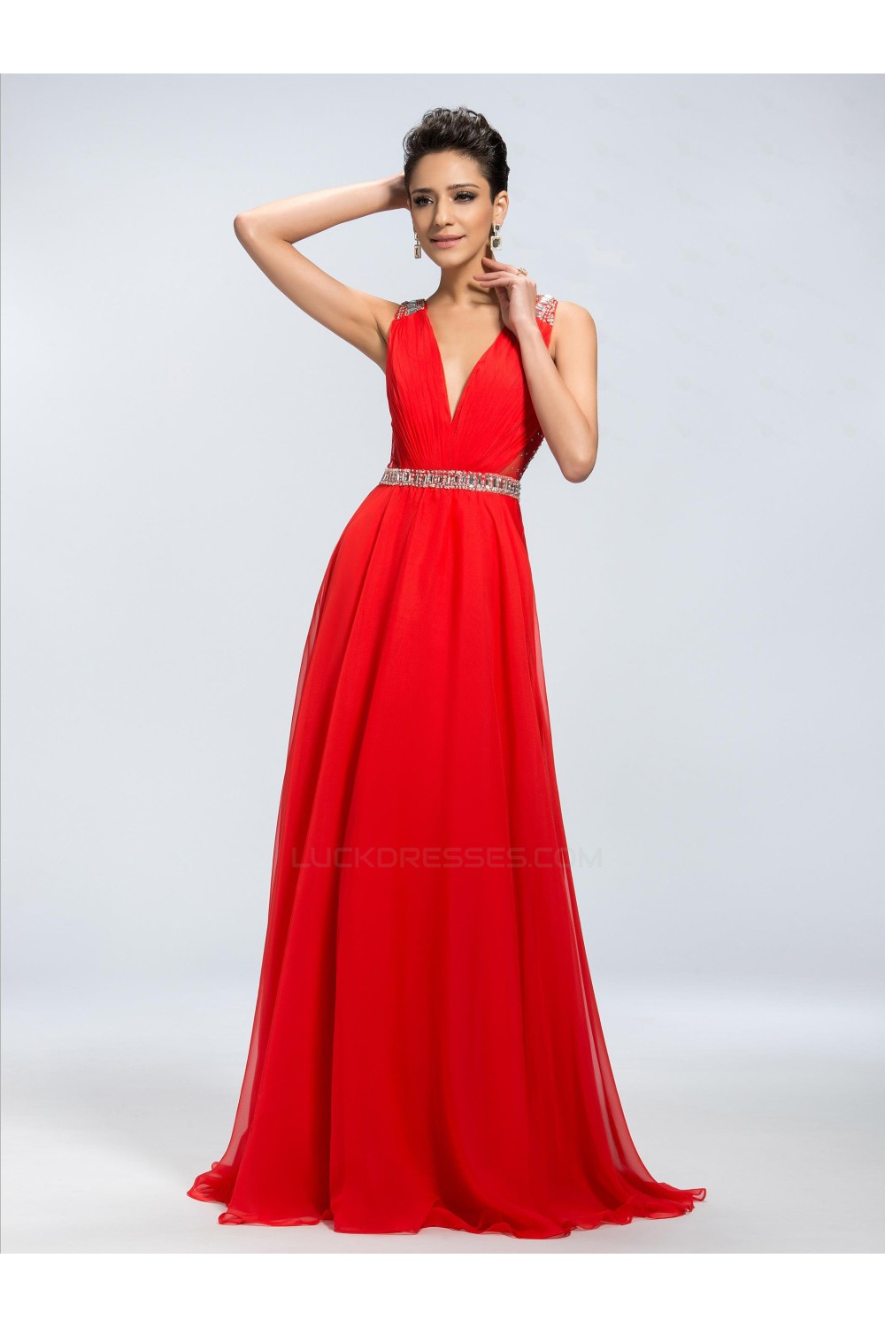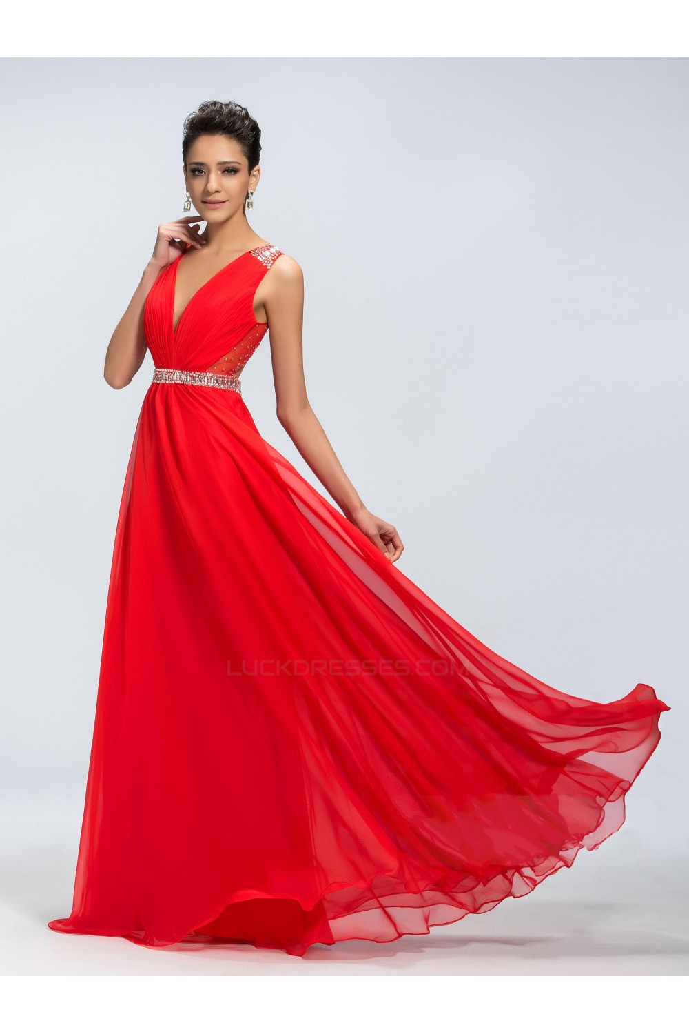 A-Line V-Neck Beaded Long Red Chiffon Prom Evening Formal Party Dresses ED010670