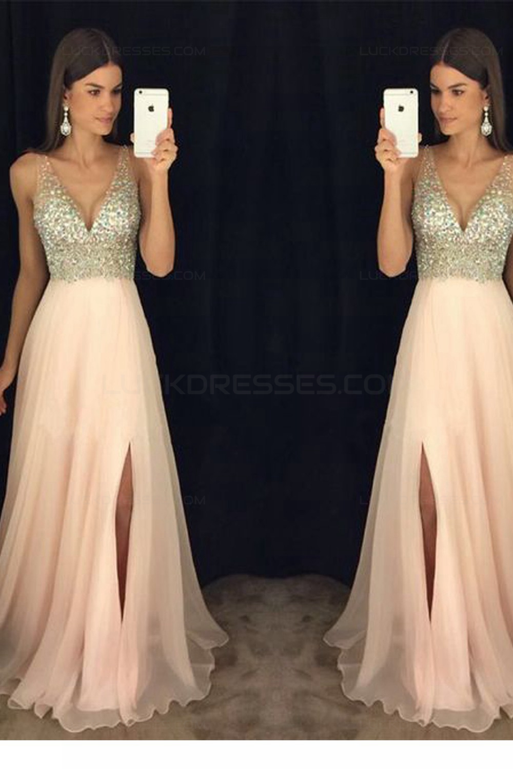 A-Line V-Neck Beaded Sequins Long Chiffon Prom Dresses Party Evening Gowns 3020276