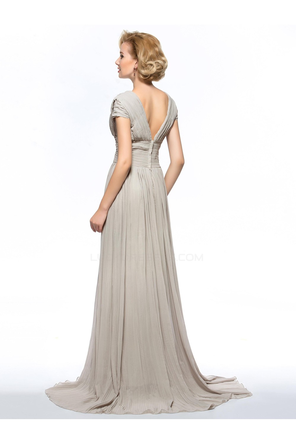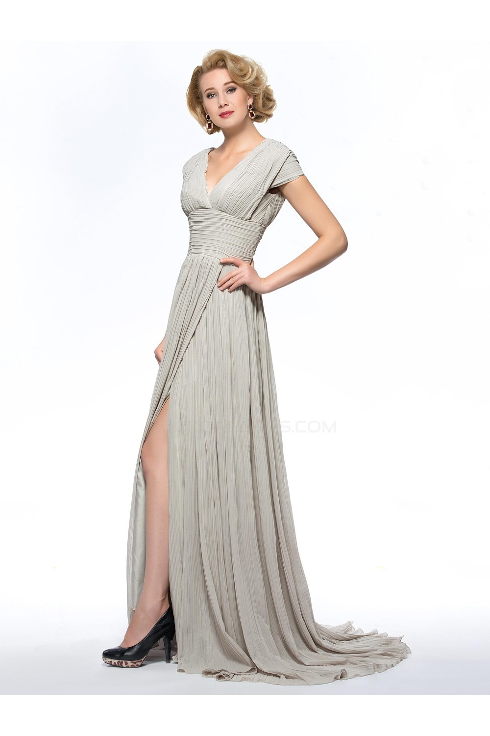 A-Line V-Neck Cap-Sleeve Pleated Split-Front Long Chiffon Mother of the Bride Dresses M010077