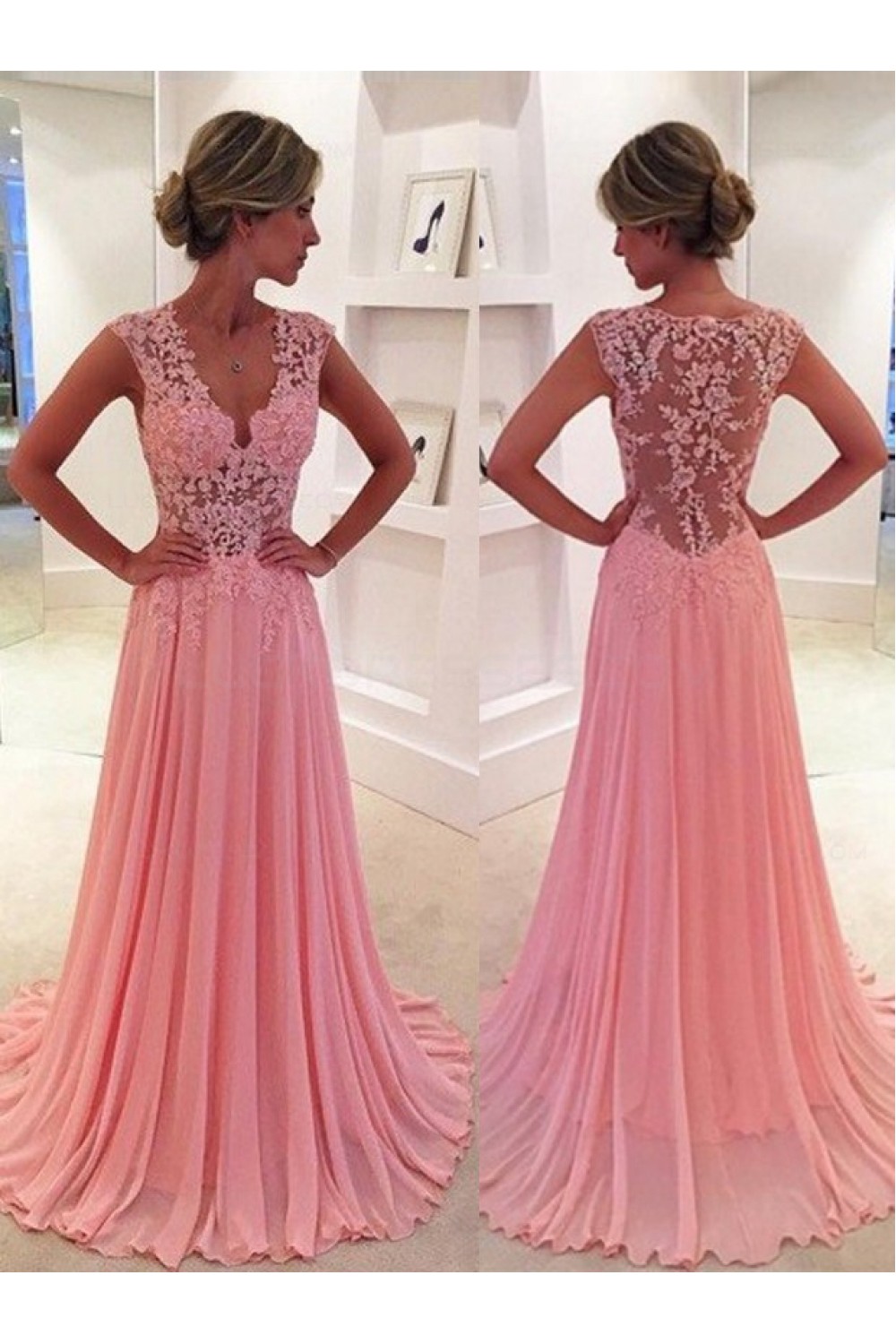 A-Line V-Neck Chiffon Lace Long Pink Prom Evening Formal Dresses 3020047