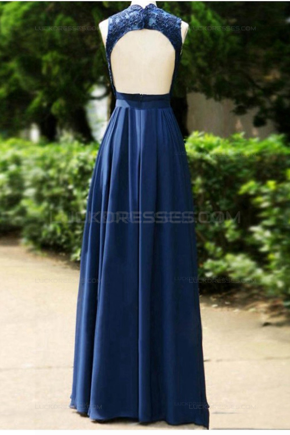 A-Line V-Neck Lace Chiffon Long Blue Open Back Wedding Guest Dresses Bridesmaid Dresses 3010225