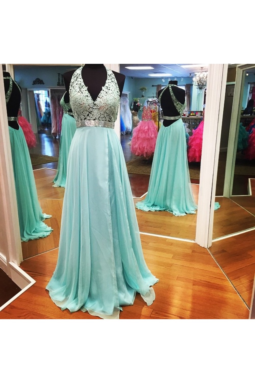 A-Line V-Neck Lace Chiffon Prom Formal Evening Party Dresses 3021306