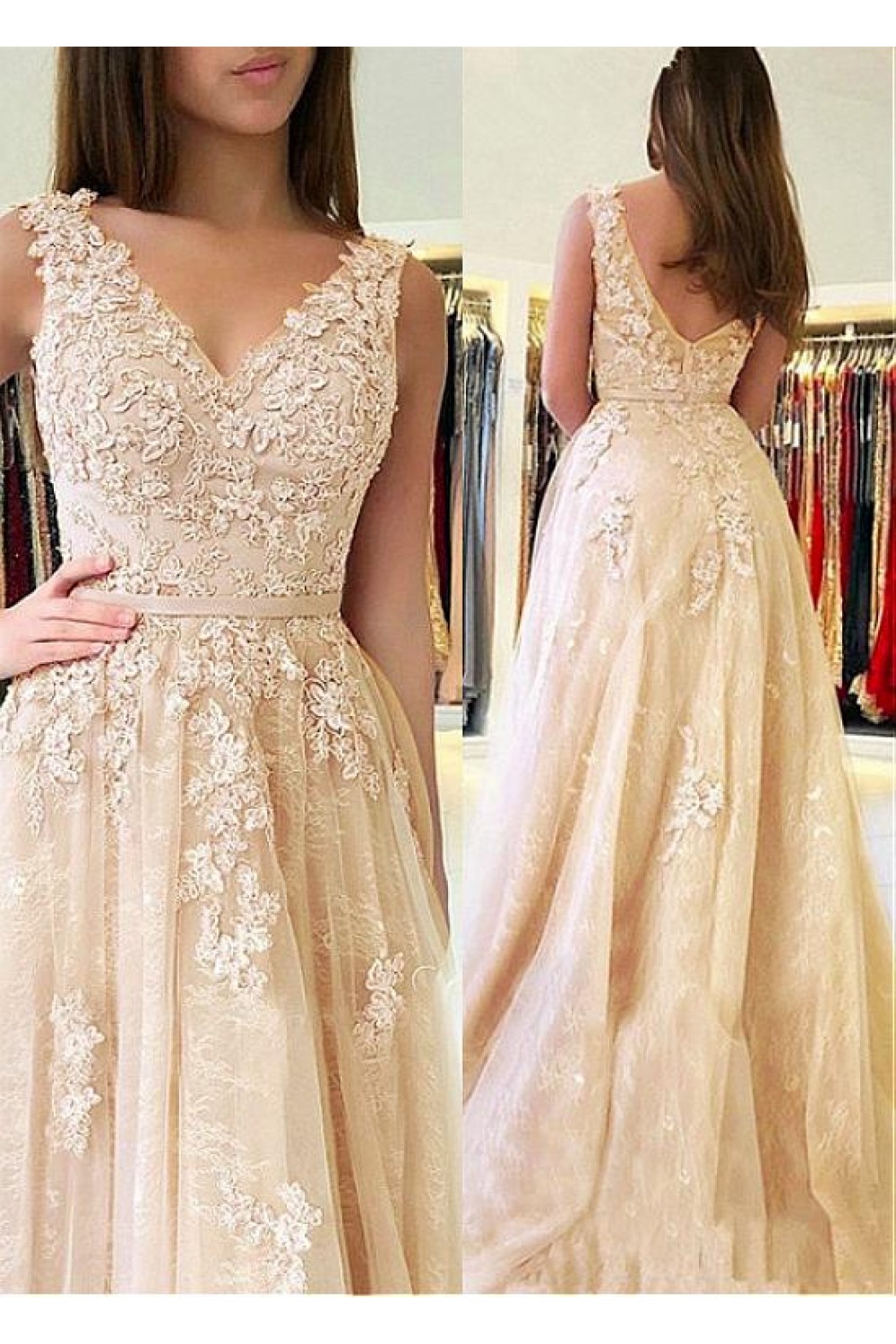 A-Line V-Neck Lace Long Prom Dresses Formal Evening Dresses 601229