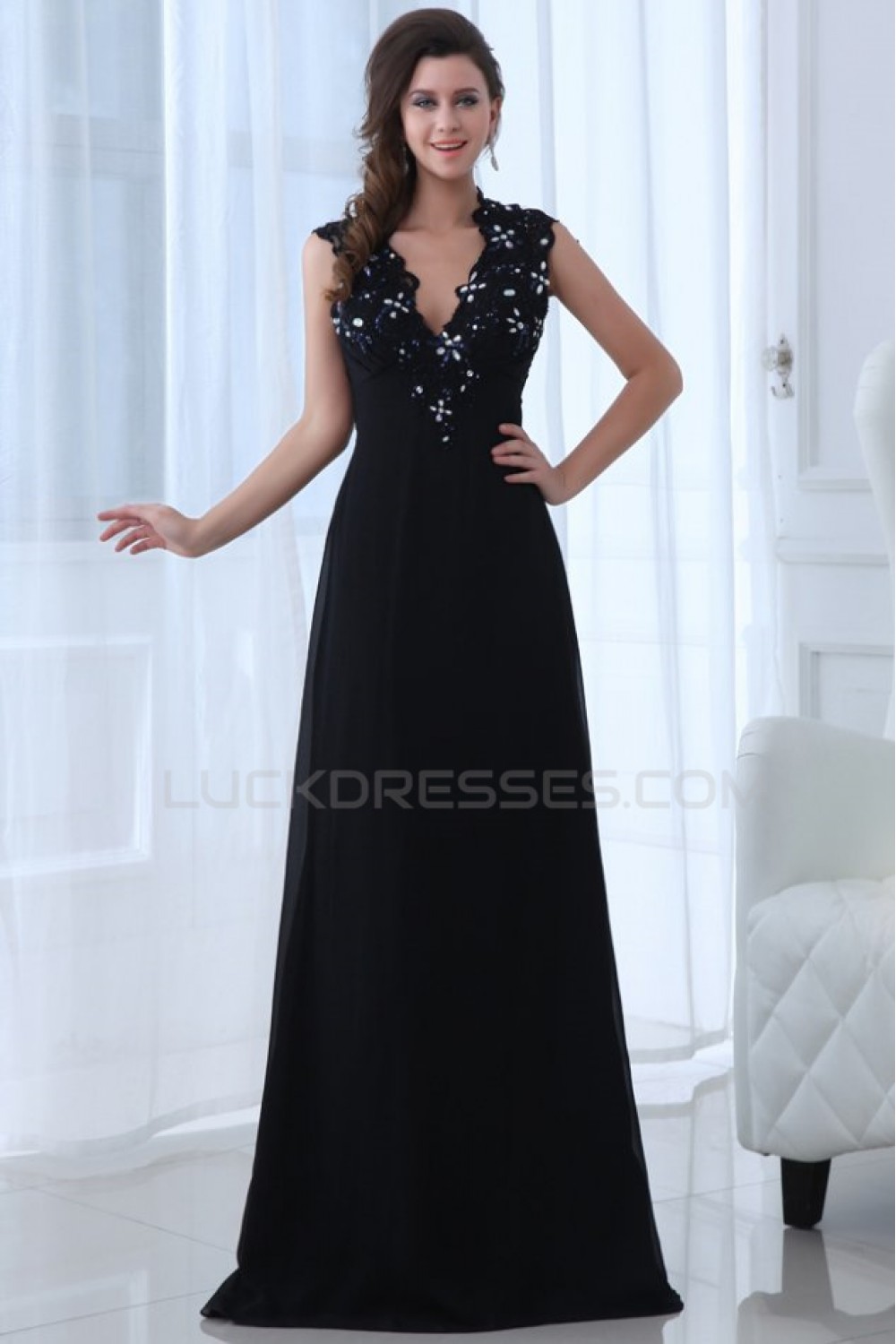 A-Line V-Neck Long Beaded Chiffon Prom Evening Formal Party Dresses ED010015