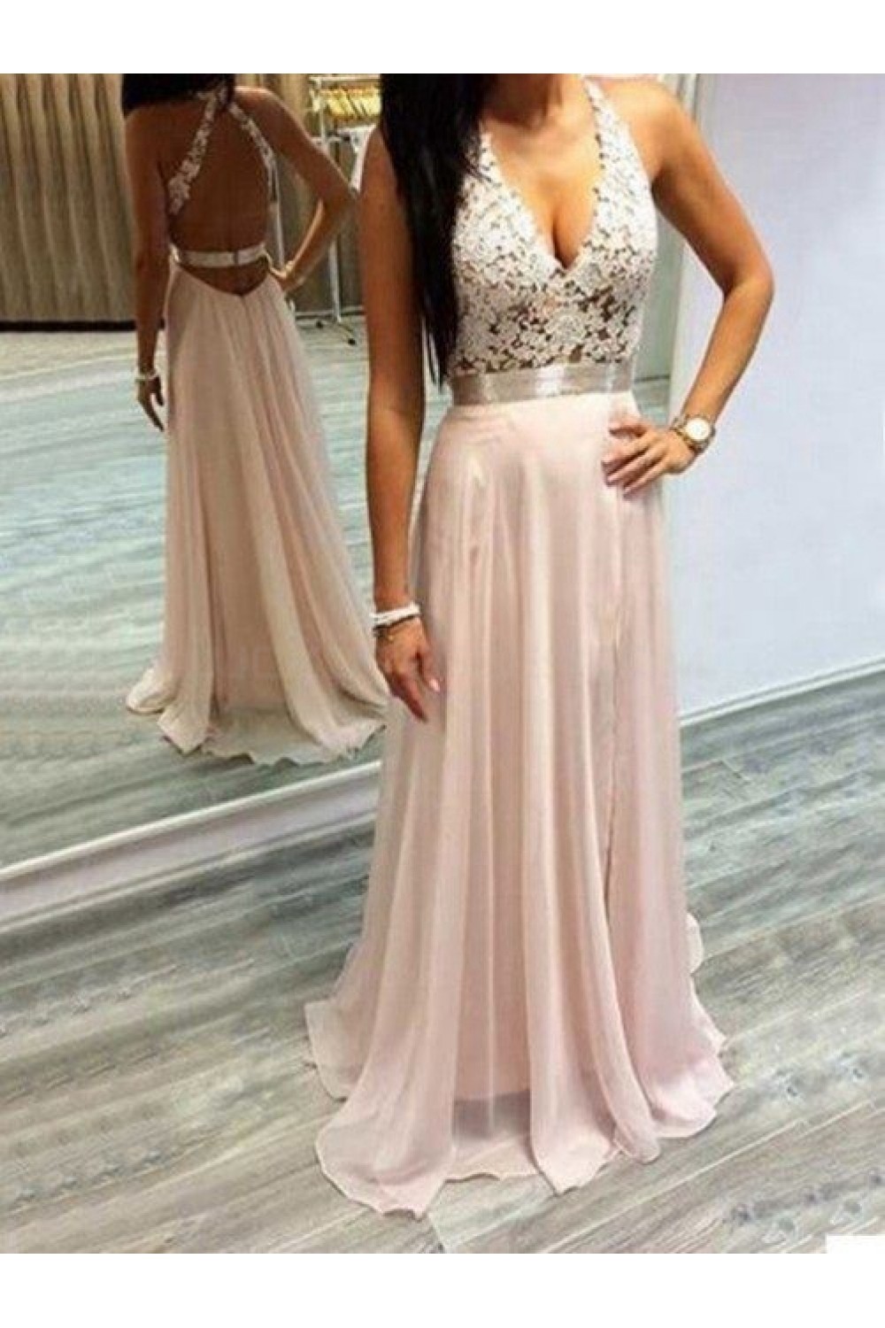 A-Line V-Neck Long Pink Lace Prom Formal Evening Party Dresses 3020893