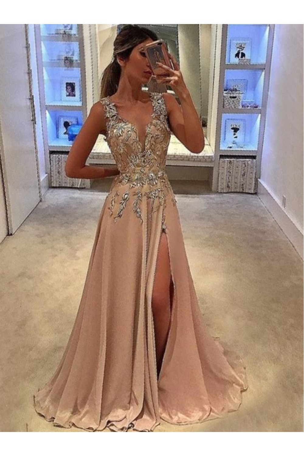 A-Line V-Neck Long Prom Dresses Formal Evening Dresses 601090