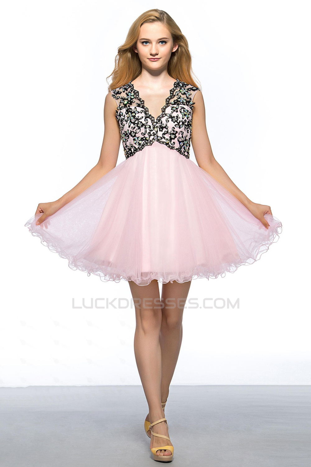 A-Line V-Neck Short Pink Applique Beaded Prom Evening Cocktail Homecoming Party Dresses ED010642