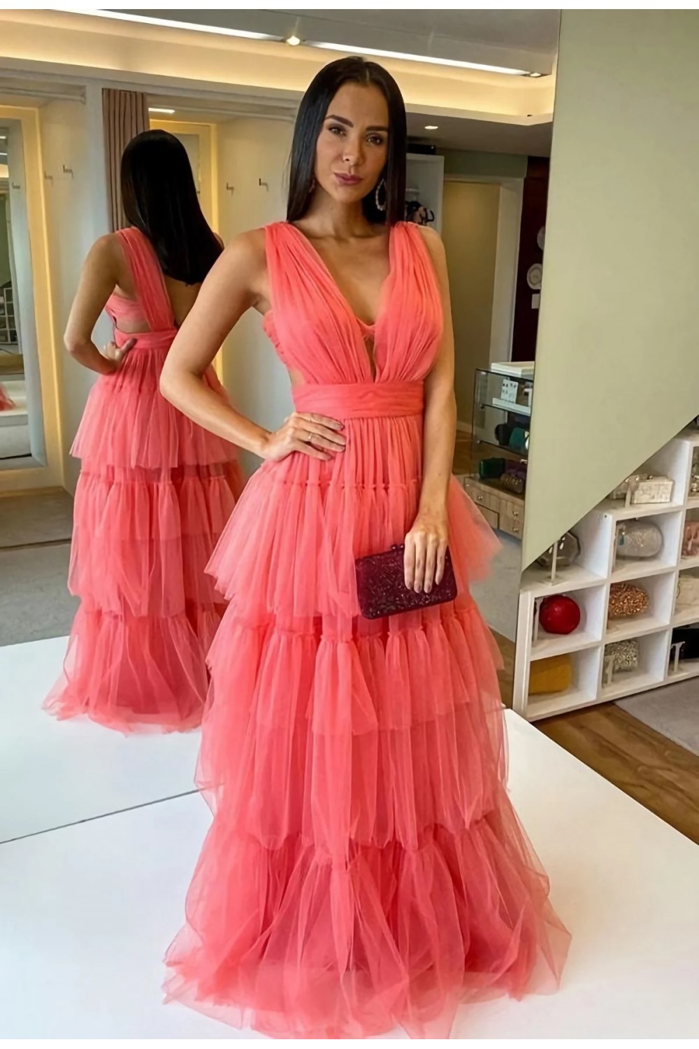 A-Line V Neck Tulle Long Prom Dresses 801590
