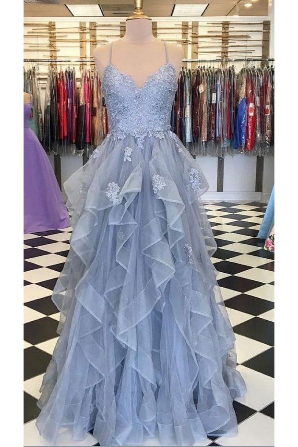 A-line Spaghetti Straps Blue Lace and Tulle Long Prom Dresses Formal Evening Dresses 901902