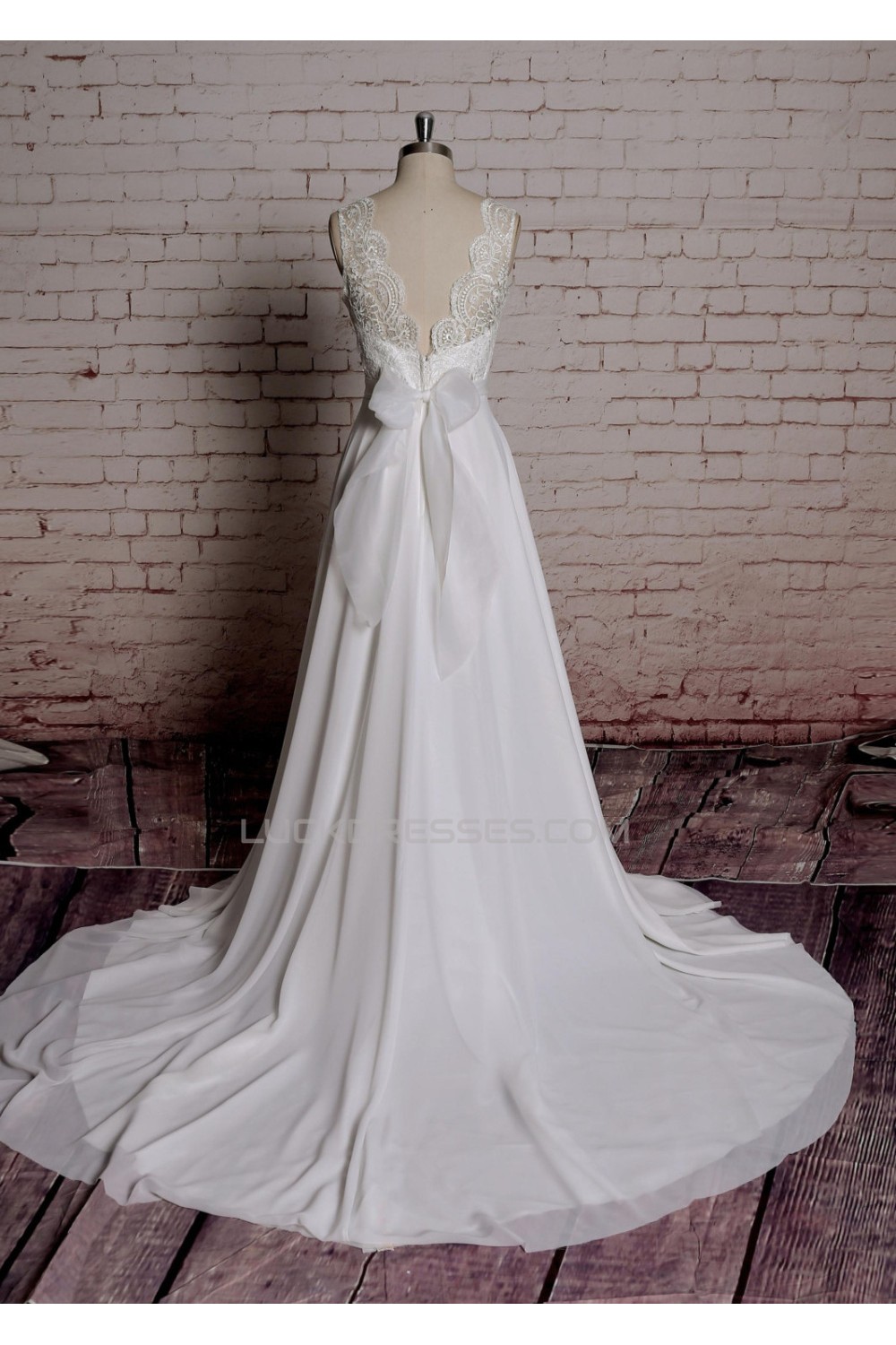 A-line V-neck Lace Bowknot Bridal Wedding Dresses WD010690