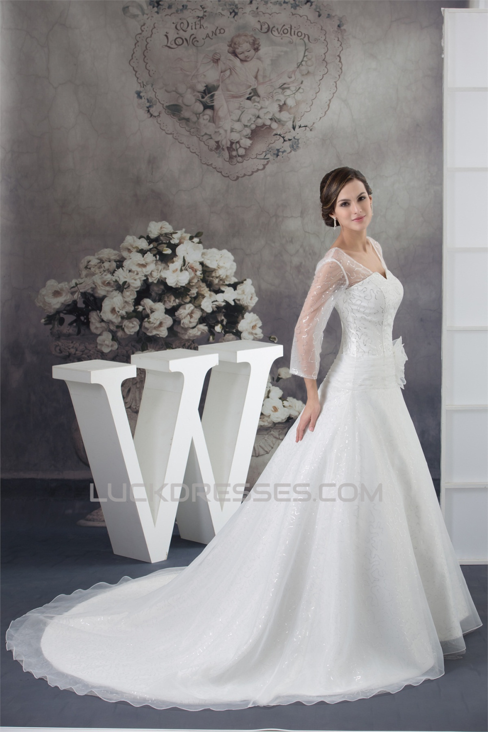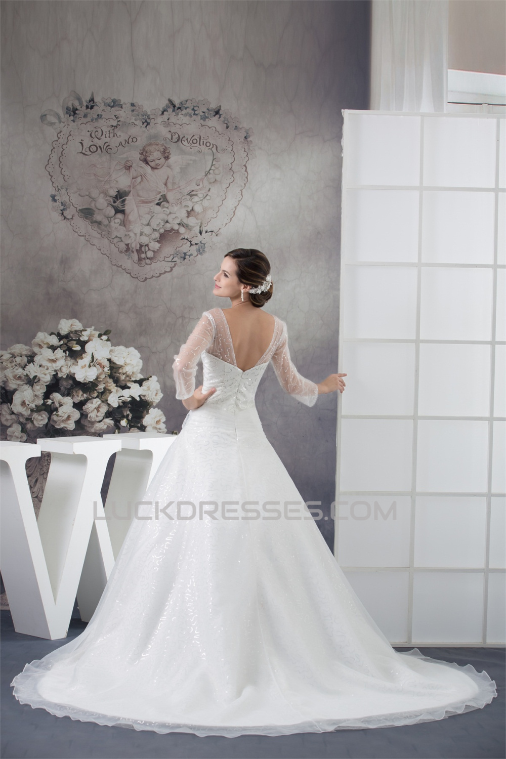Amazing V-Neck A-Line Long Sleeve Satin Organza Sequins Wedding Dresses 2030060
