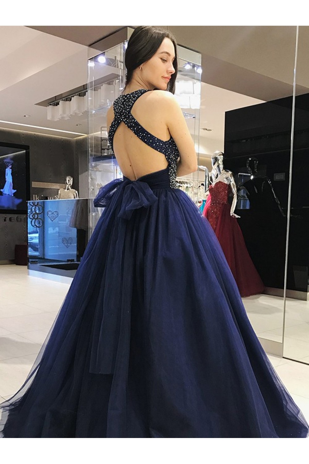 Ball Gown Beaded Long Navy Blue Prom Dress Formal Evening Dresses 601662