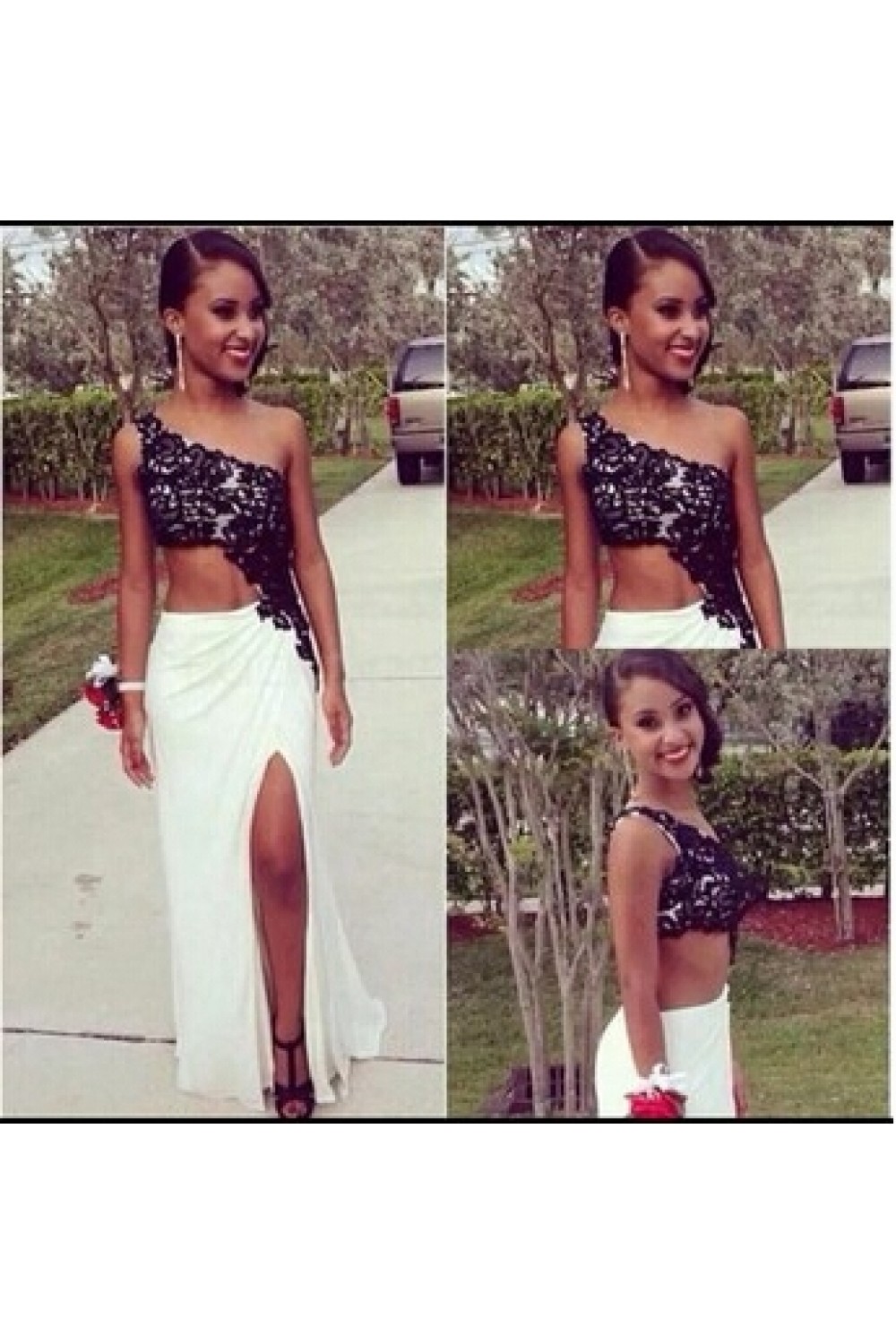 Black Lace White One-Shoulder Long Prom Formal Evening Party Dresses 3021089