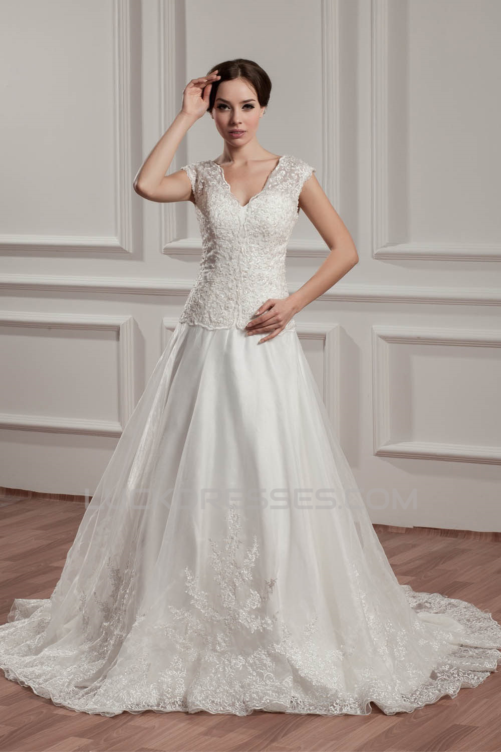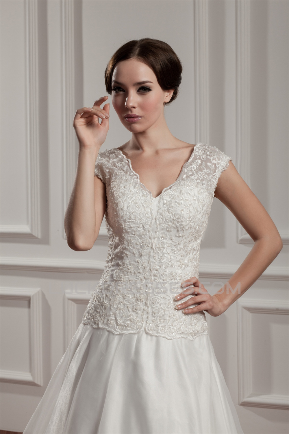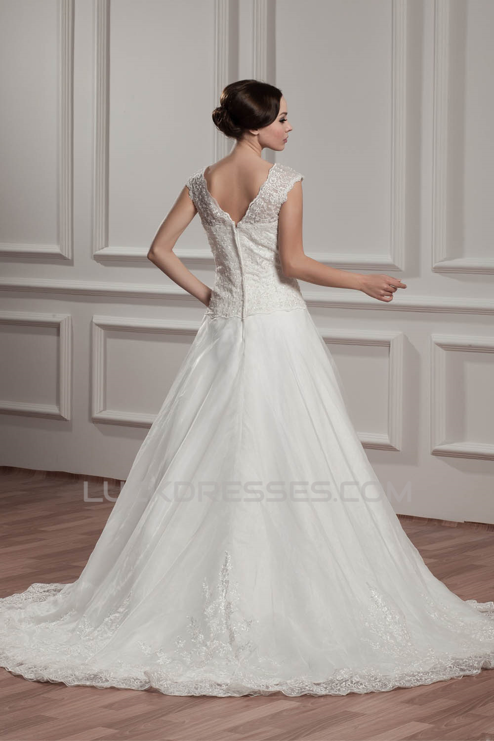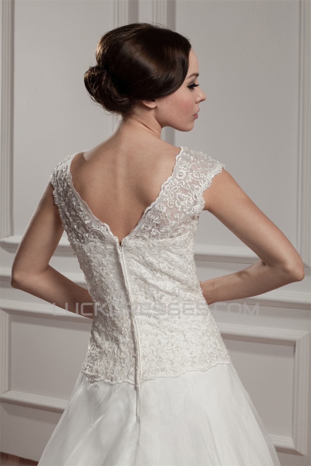 Breathtaking V-Neck A-Line Satin Organza V-Neck Lace Wedding Dresses 2030647