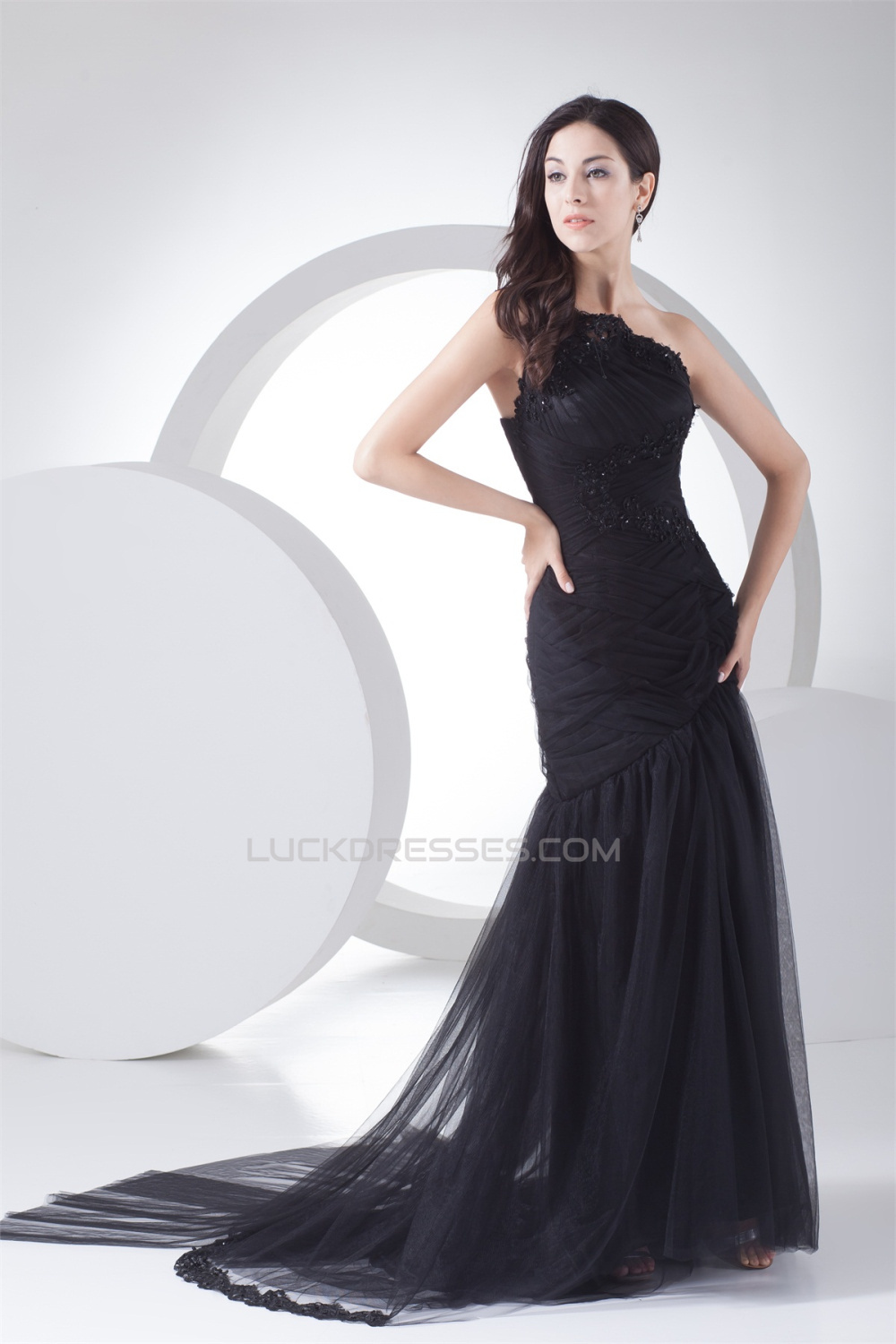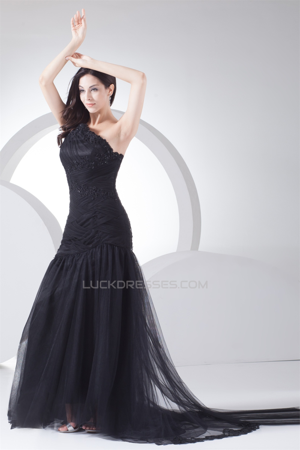 Brush Sweep Train Beading Mermaid/Trumpet One-Shoulder Long Black Prom/Formal Evening Dresses 02020110