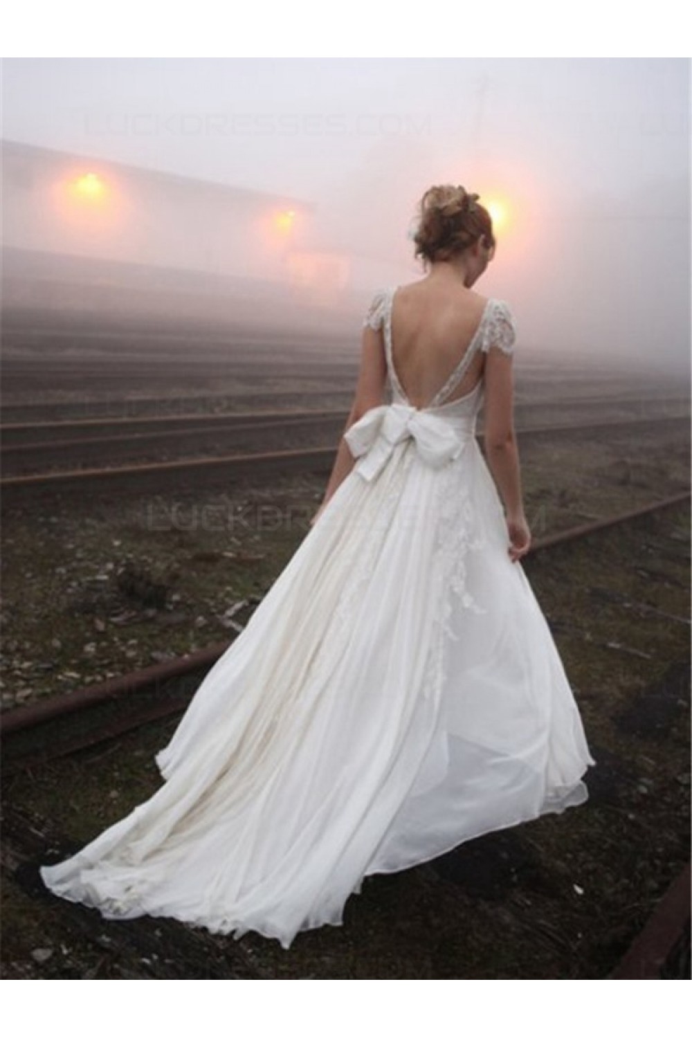 Cap Sleeves Lace Chiffon Backless Wedding Dresses Bridal Gowns 3030158