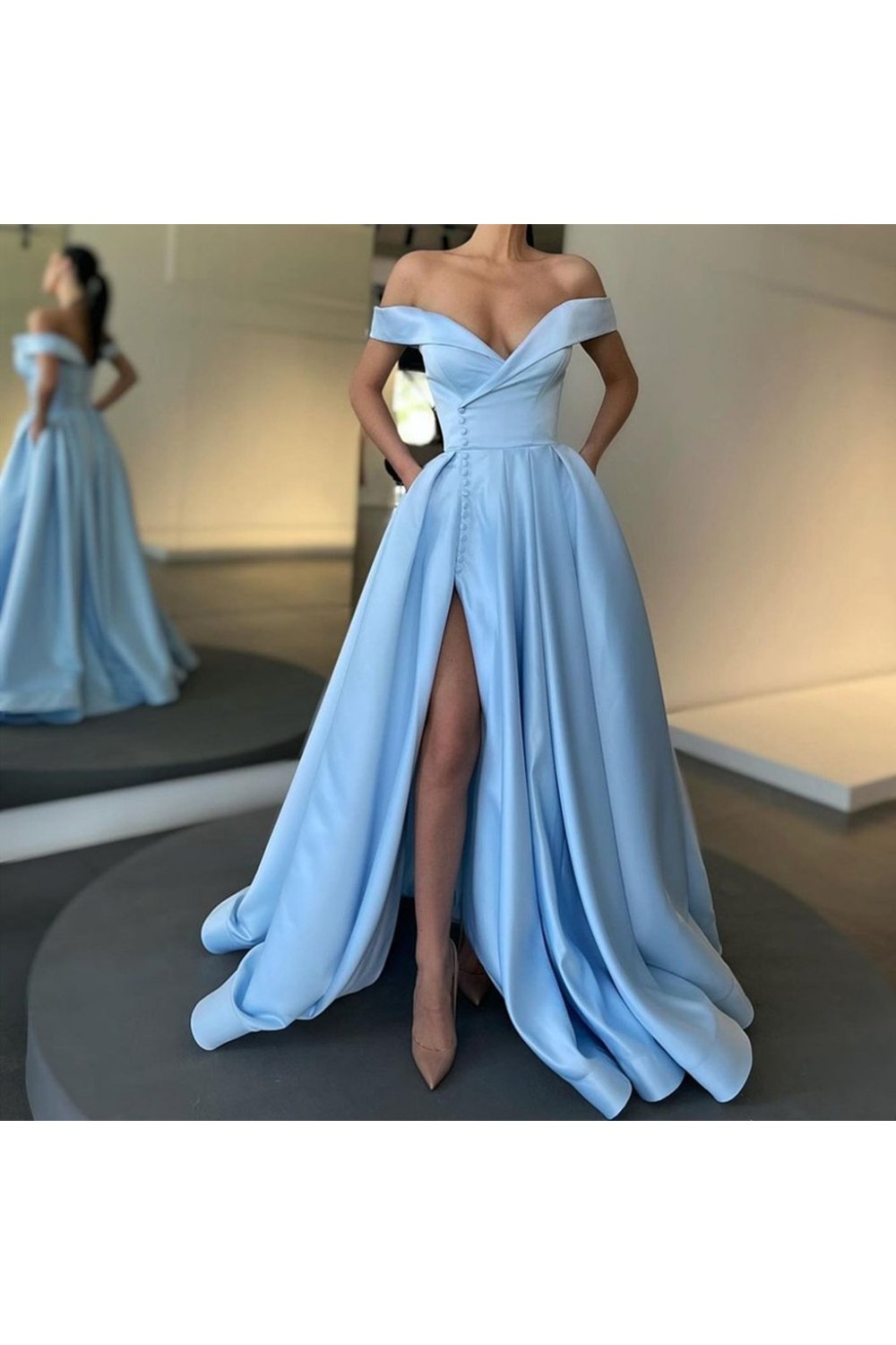 Elegant Long Blue Satin Off the Shoulder Prom Dress Formal Evening Gowns 901260