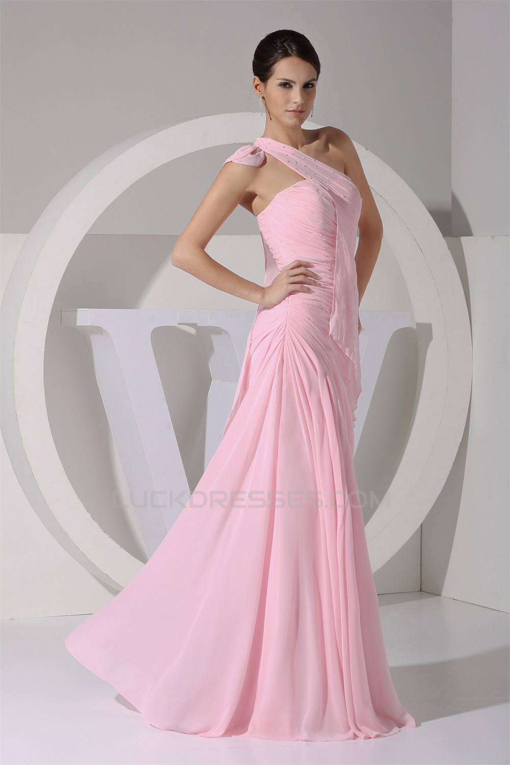 Elegant One-Shoulder Long Pink Chiffon Prom Evening Bridesmaid Dresses 02020347