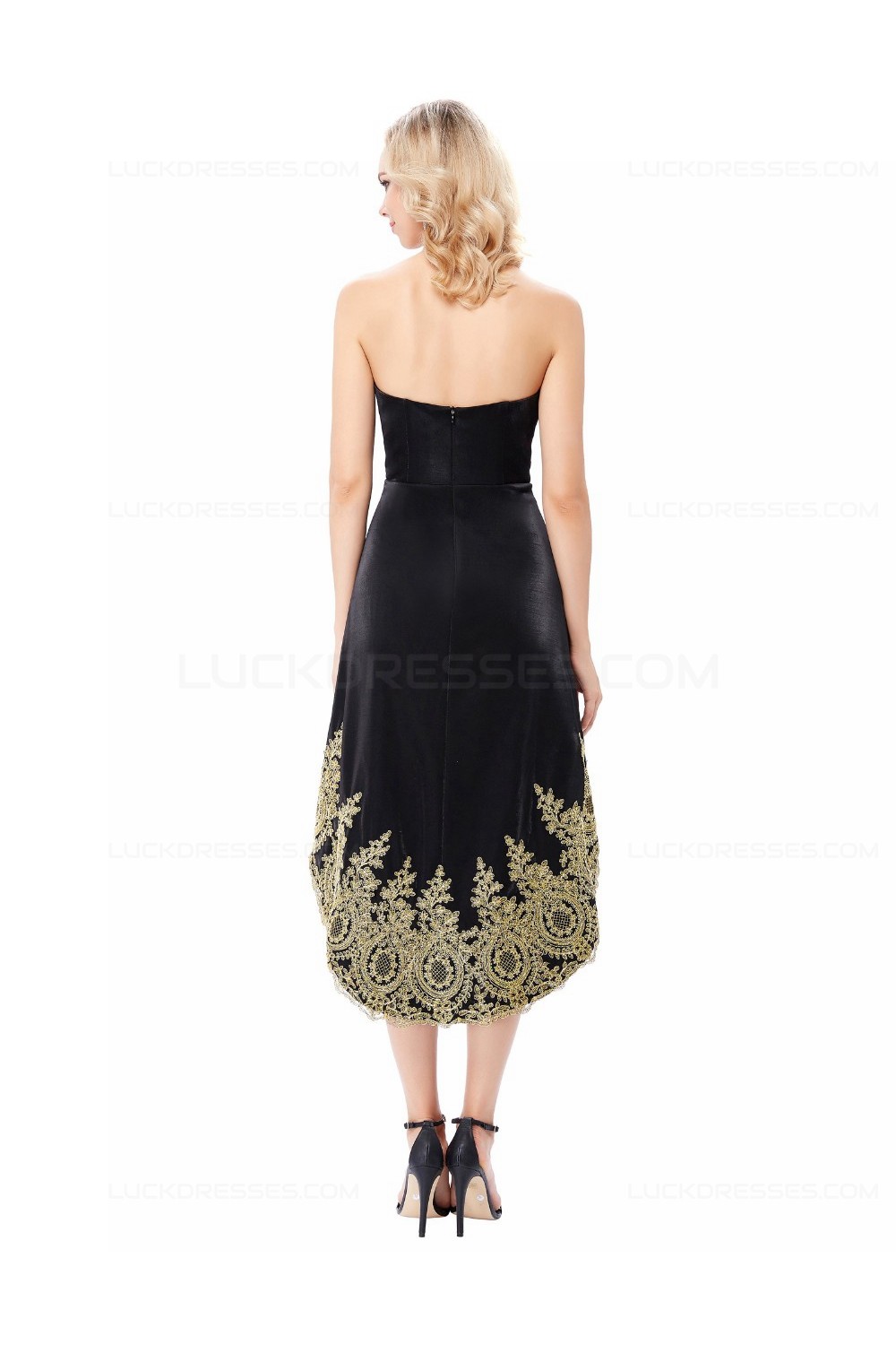 High Low Sweetheart Short Black Gold Lace Appliques Prom Dresses Party Evening Gowns 3020291