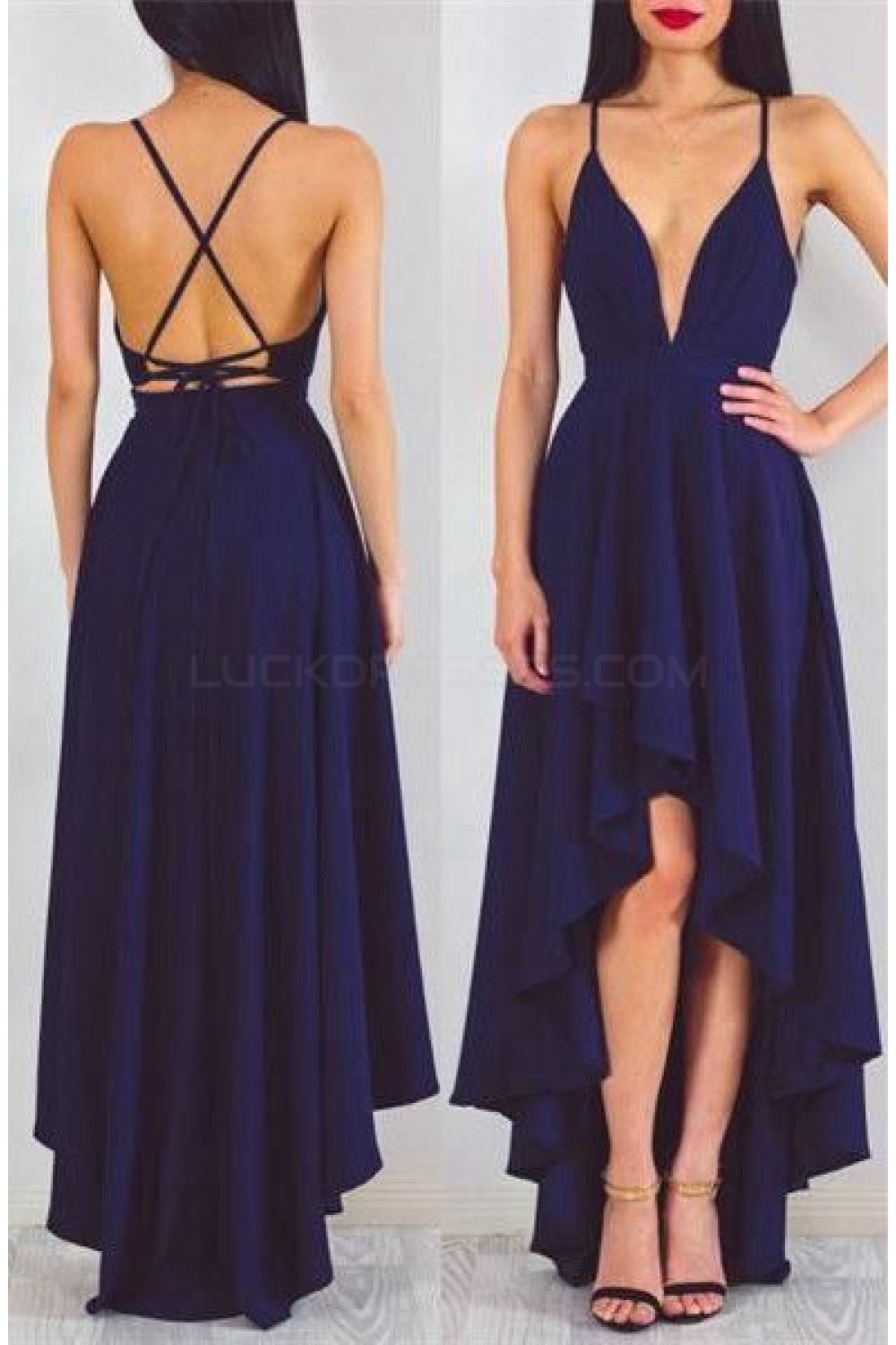 High Low V-Neck Spaghetti Straps Blue Prom Formal Evening Party Dresses 3021470