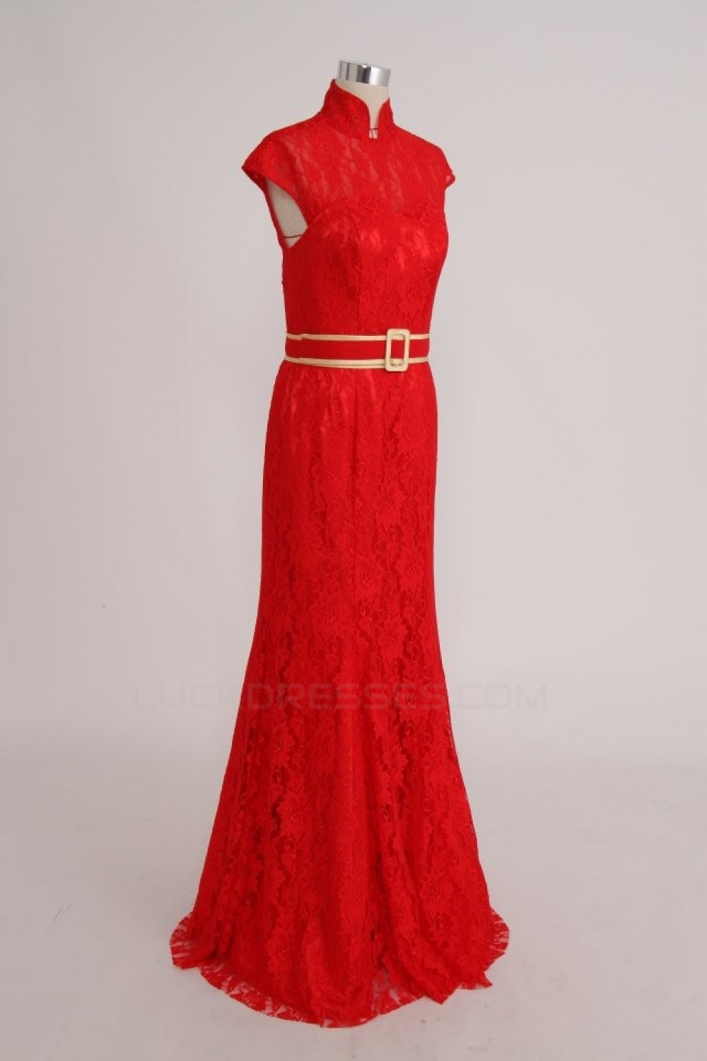 High Neck Long Red Lace Prom Evening Formal Party Dresses ED010758