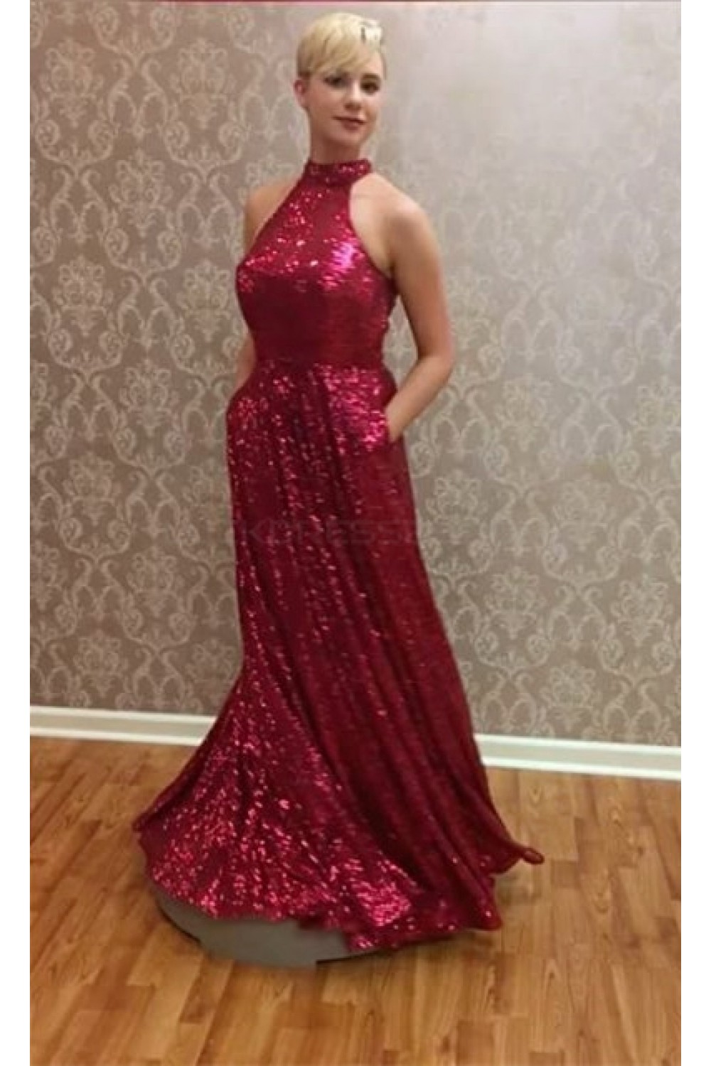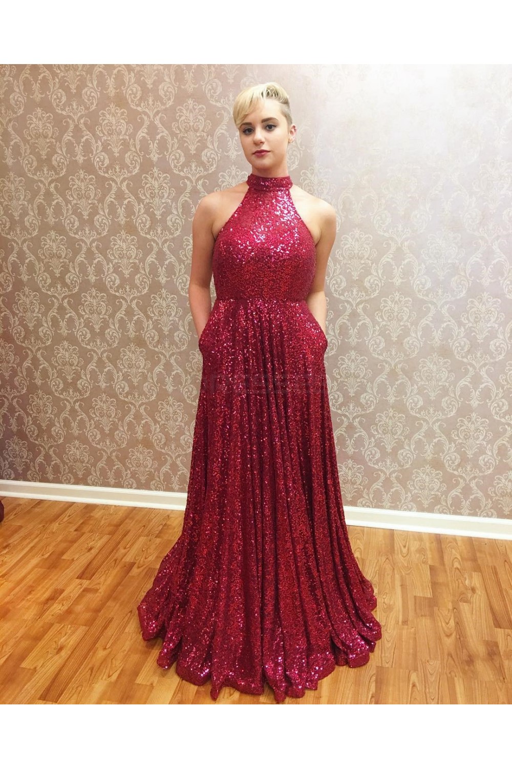 High Neck Sequins Long Prom Formal Evening Party Dresses 3021177
