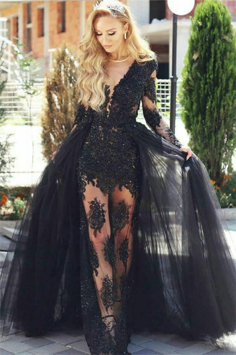 -61% Lace and Tulle V-Neck Long Black Prom Dress Formal Evening Dresses 601463