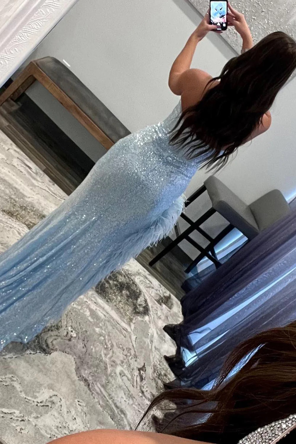 Light Blue Sequins Sweetheart Long Prom Dresses with Feathers 801024