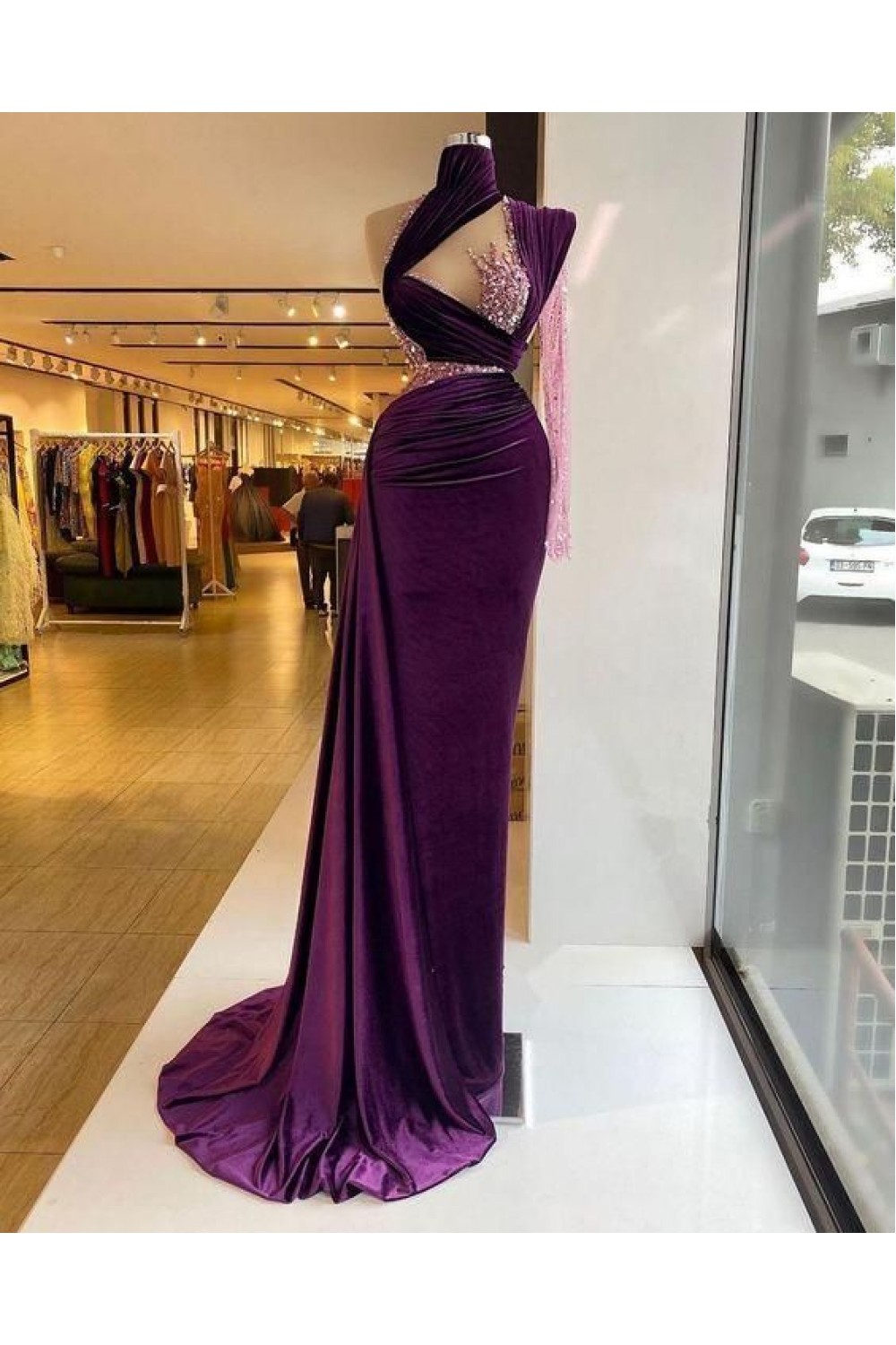Long Beaded Purple Prom Dresses with One Sleeve 801181