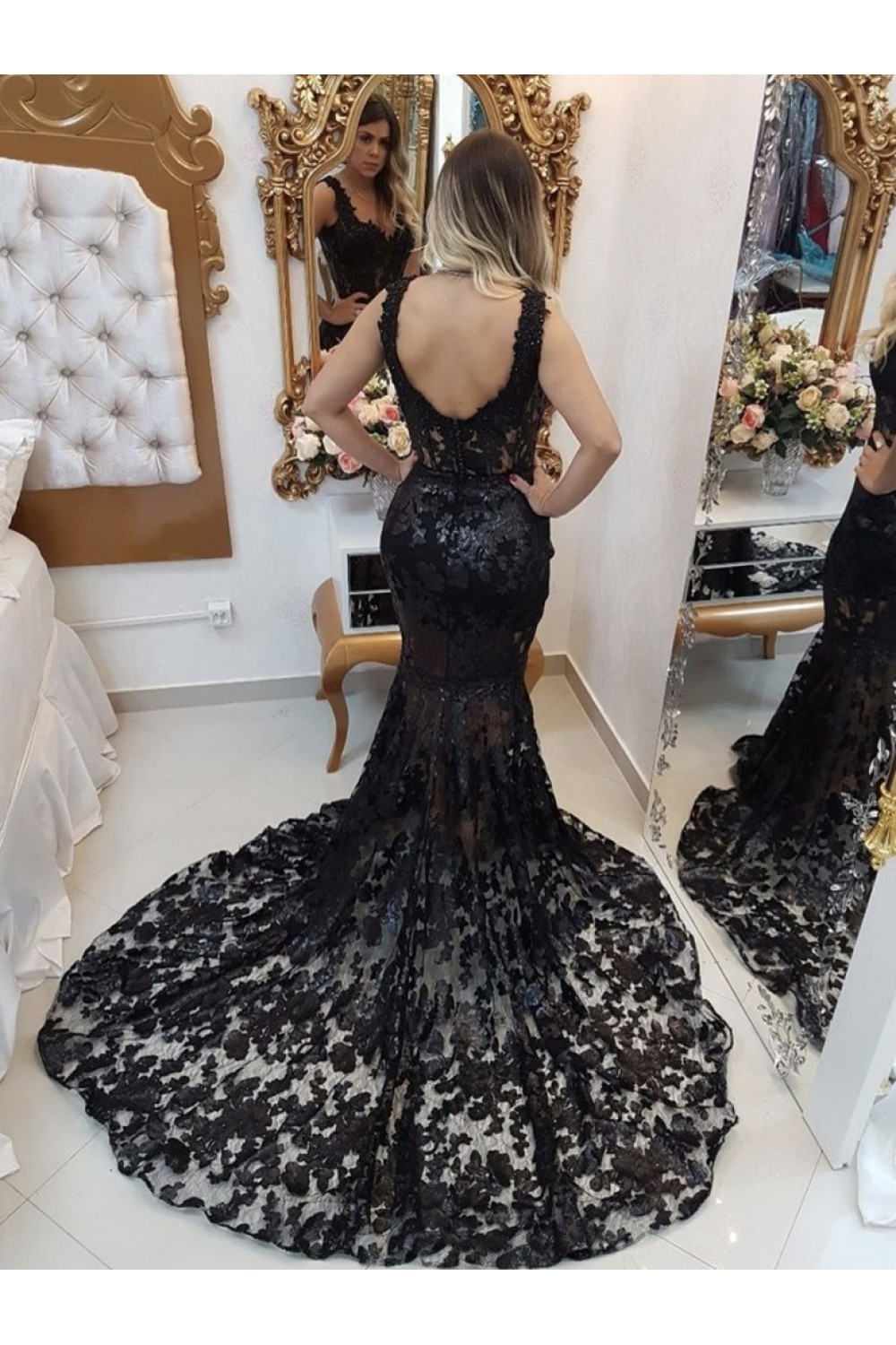 Long Black Mermaid Lace Prom Dress Formal Evening Gowns 901282