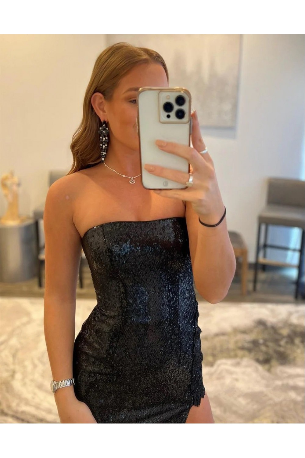 Long Black Strapless Sequins Prom Dresses with Slit 801217
