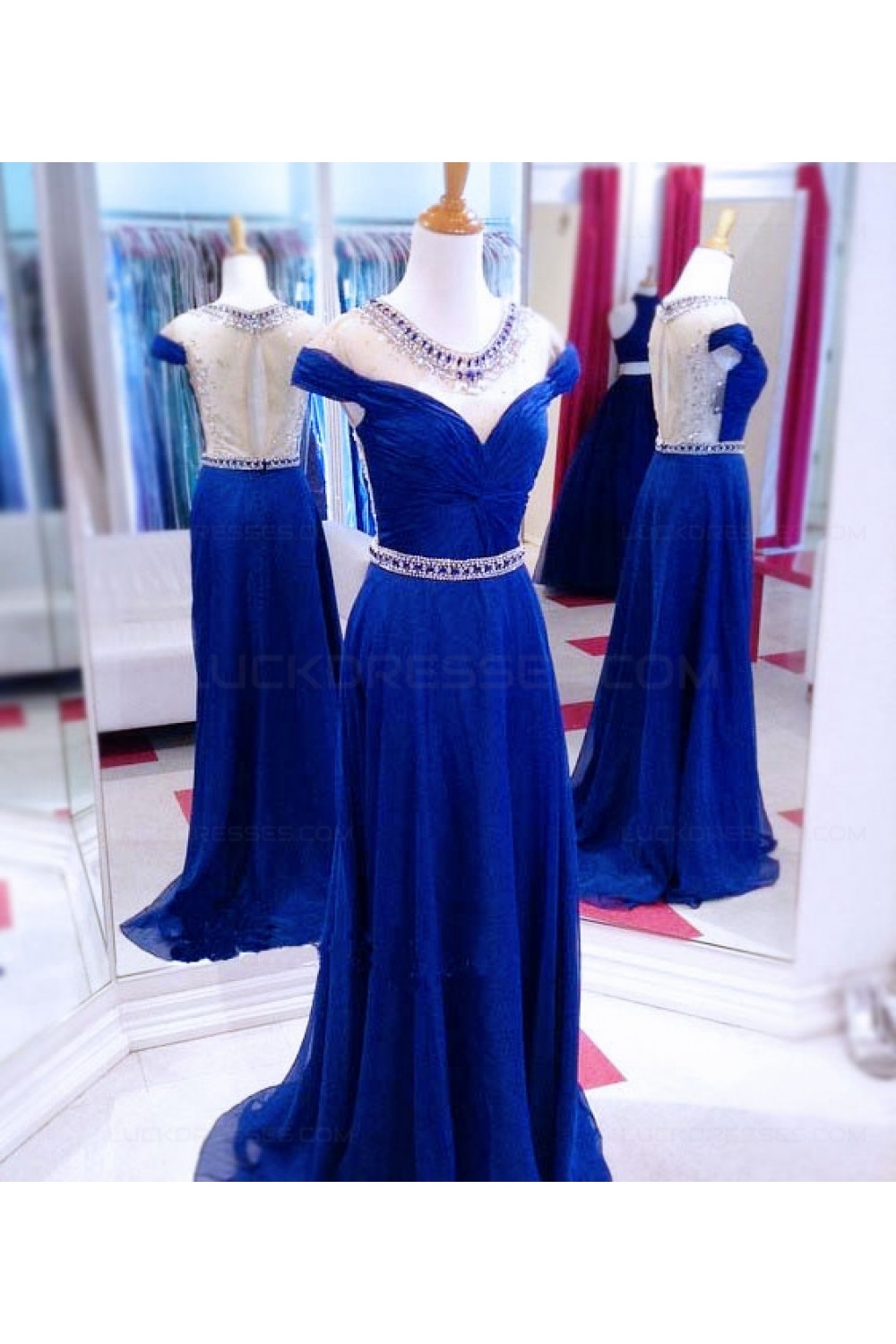 Long Blue Beaded Illusion Neckline Prom Dresses Party Evening Gowns 3020511