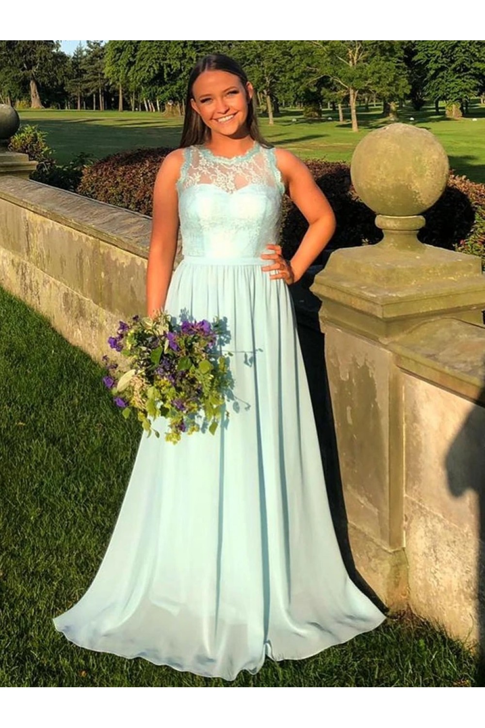 Long Blue Chiffon and Lace Prom Dresses Formal Evening Gowns 901016